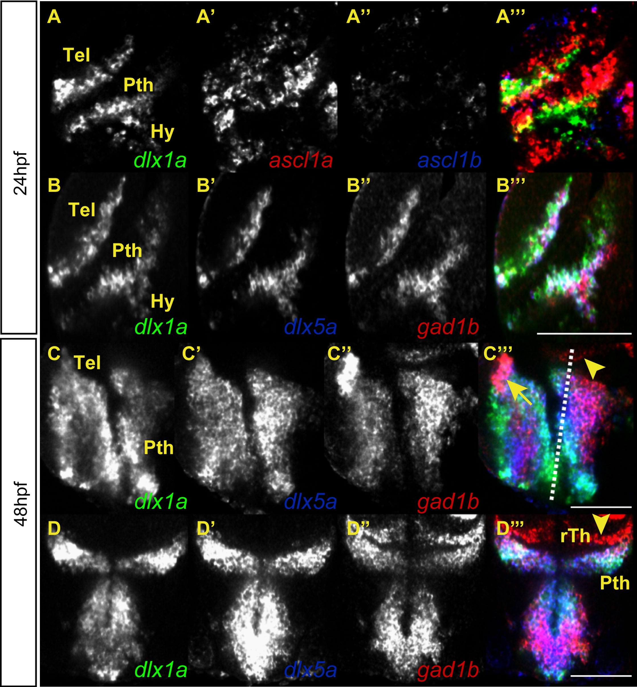 Fig. 1 The expression domains of the ascl1a, dlx, and gad1b genes overlap in the forebrain of the embryonic zebrafish. Single z sections on triple fluorescent in situ hybridizations. (A) In the forebrain lateral view of a WT embryo, the dlx1a and ascl1a are co-expressed throughout the telencephalon and prethalamus at 24 hpf, while ascl1b is not co-expressed at this stage. (B) The dlx1a, dlx5a, and gad1b genes are co-expressed in the telencephalon, prethalamus, and hypothalamus at 24 hpf. (C) The dlx1a, dlx5a, and gad1b genes continue to be co-expressed in the telencephalon and prethalamus at 48 hpf. The gad1b expression is increased in the dorsal tip of the telencephalon (arrow). The plane of section for (D) is shown as a dotted line in C′′′. (D) Cross-section showing the co-expression of dlx1a, dlx5a, and gad1b in the prethalamus (arrow). The rostral thalamus (arrowhead) is positive for gad1b expression but not dlx1 or dlx5a. Tel=telencephalon, Pth=prethalamus, Hy=hypothalamus, rTh=rostral thalamus. Scale bar in A–D=100 μm and in E=40 μm.