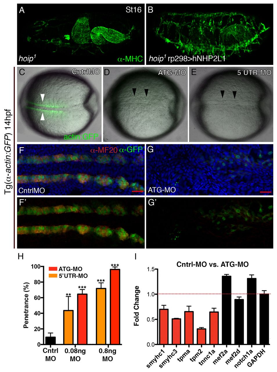 Hoip is a conserved regulator of myogenesis. (A,B) St16 Drosophila embryos labeled for MHC protein. Compared with hoip1 embryos (A), hoip1 rp298>human NHP2L1 embryos show a significant restoration of MHC protein expression and muscle morphology in the somatic mesoderm (B). (C-E) Dorsal views of 14 hpf Tg (α-actin:GFP) zebrafish embryos. Embryos injected with control MO at the one-cell stage express robust GFP in somites (C, white arrowheads). Embryos injected with nhp2l1b ATG-MO (D) or 52UTR-MO (E) do not initiate GFP expression. ATG-MO and 52UTR-MO embryos develop a distinguishable neural tube by 14 hpf (black arrowheads). (F-G2) Dorsal view of 14 hpf Tg(α-actin:GFP) zebrafish embryos labeled for GFP and MF20 (which reacts with muscle MyHC isoforms). Embryos injected with control MO show robust GFP and MF20 expression in the somatic mesoderm (F), whereas ATG-MO injected embryos display little or no GFP or MF20 staining (G). (H) Dose-dependent response to nhp2l1b MOs. Percent penetrance was calculated as the number of embryos without detectable GFP fluorescence, relative to all injected embryos. Significance between ATG-MO/52UTR-MO and Cntrl MO was calculated using a t-test. **P<0.01, ***P<0.001. (I) qPCR of mesoderm transcript expression. Relative expression was calculated as mRNA levels in control versus ATG-MO-injected embryos after normalization to GAPDH. Error bars represent s.e.m.
