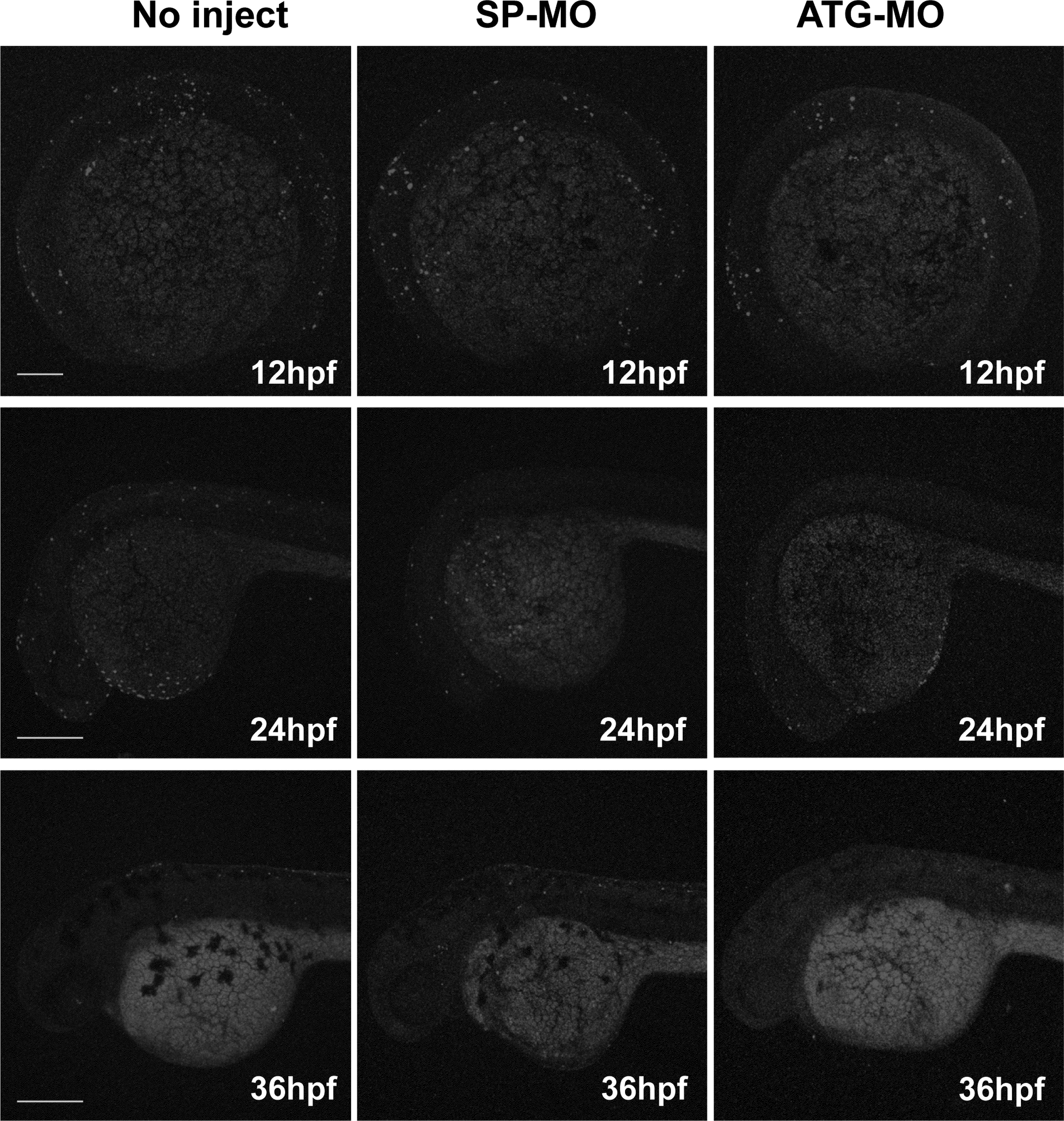 Apoptosis analysis with TUNEL staining of ztfpi-2 morphants at 12 hpf, 24 hpf and 36 hpf. The fluorescent signal for SP-MO and ATG-MO was similar to the uninjected control at all three stages. The scale bar is 200 μm.