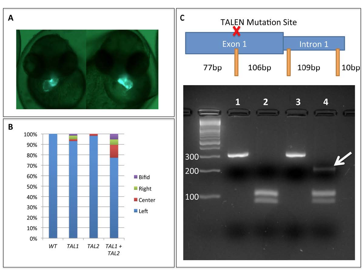 Injection of RNA encoding TALENs that target hspb7 generate cardiac defects that phenocopy the hspb7 morphants. A) Representative phenotypes of injected embryos at 3 dpf demonstrating cardiac morphogenetic defects including right-sided (left) or non-looping (right) abnormalities. B) Quantification of heart tube phenotypes at 30 hpf in wildtype (n = 29), or embryos injected with RNA encoding TAL1 alone (n = 58), TAL2 alone (n = 53), or TAL1+TAL2 (n = 57). C) Injection of TALEN RNA results in mutations at the hspb7 target site in embryos displaying cardiac morphogenetic defects when compared to uninjected controls. Lane 1) Amplicon from 5011/12 primer set using genomic DNA from uninjected embryos. Lane 2) Amplicon from lane 1 digested with HpyCH4V restriction enzyme. Lane 3) Amplicon from 5011/12 primer set using genomic DNA from Hspb7 TAL1+TAL2 injected embryos displaying cardiac morphogenetic defects. Lane 4) Amplicon from lane 3 digested with HpyCH4V restriction enzyme. The schematic above illustrates the PCR product that contains 3 potential HpyCH4V restriction sites (orange lines) one of which is in the TALEN-targeted sequence (red X). Unmodified DNA is digested to a 106/109 bp doublet, and a smaller 77 bp fragment (and a small 10 bp fragment that is not seen). Arrow indicates HpyCH4V resistant 183 bp fragment due to mutation of the HpyCH4V restriction site in the TALEN target region. Molecular size markers are in the leftmost lane.