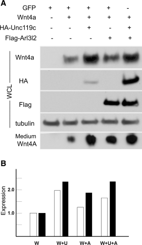 Cultured HEK293T cells were transiently transfected with Wnt4a, with or without HA-Unc119c and Flag-Arl3l2, as described in the Experimental Procedures section. A: Wnt4a, Unc119c, and Arl3l2 in whole cell lysates were detected by immunoblotting, while secreted Wnt4a was recovered from the medium by immunoprecipitation before blotting. B: Quantification of the gel using ImageJ shows the level of Wnt4a extracted from cells (open bars) or recovered from the medium (filled bars). Cells were transfected with Wnt4a (W), Wnt4a and Unc119c (W+U), Wnt4a and Arl3l2 (W+A), or all three (W+U+A). The level of expression in the Wnt4a lane was set as one.
