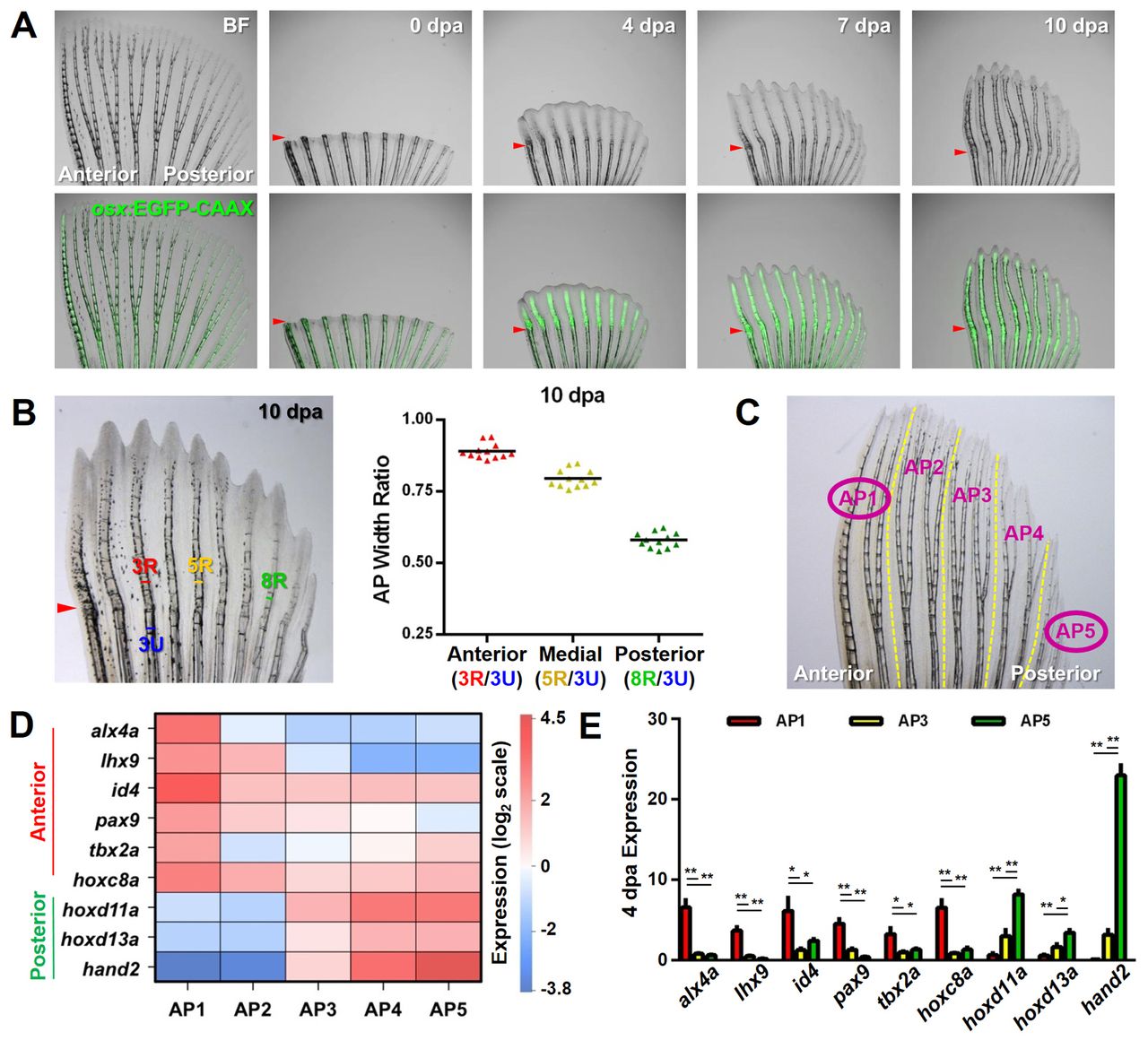 Regeneration of pattern and underlying differential gene expression in pectoral fins. (A) Zebrafish pectoral fins possess and regenerate an anteroposterior (AP) skeletal pattern. Early osteoblasts marked by osx:EGFP-CAAX (green) are present in the regenerate prior to the onset of AP differences, which arise between 5 and 7 days post-amputation (dpa). Arrowheads indicate amputation plane. BF, bright field. (B) Zebrafish robustly regenerate the AP bone pattern. Quantification of the relative ratios between the width of the uninjured portion of anterior ray 3 (blue) and the widths of regenerating rays across the AP axis. n=12; bar indicates mean. (C) Diagram of a pectoral fin defining the two regions used for RNA-Seq (circled AP1 and AP5) and the five regions (AP1-AP5) used for subsequent qPCR validations. (D) Each AP region of uninjured zebrafish pectoral fins expresses a unique AP code of patterning transcription factor genes. Results shown reflect qPCR confirmation of RNA-Seq data, normalized to β-actin 1 (actb1) levels. n=3. (E) The AP regionalized expression of transcription factor genes is maintained during regeneration. qPCR expression profiles at 4 dpa, normalized to actb1 levels. n=3; mean ± s.e.m.; *P<0.05, **P<0.005, Student’s t-test.
