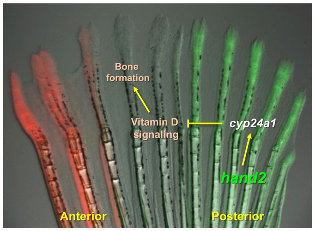 Model for Hand2 influences on positional memory. Adult zebrafish pectoral fins maintain region-specific expression of transcription factor genes. Levels of the posterior transcription factor gene hand2 can help control bone patterning during pectoral fin regeneration. Hand2 levels regulate bone formation during regeneration by direct or indirect regulation of the vitamin D-inactivating enzyme encoded by cyp24a1, restricting bone formation in the posterior rays of pectoral fins.