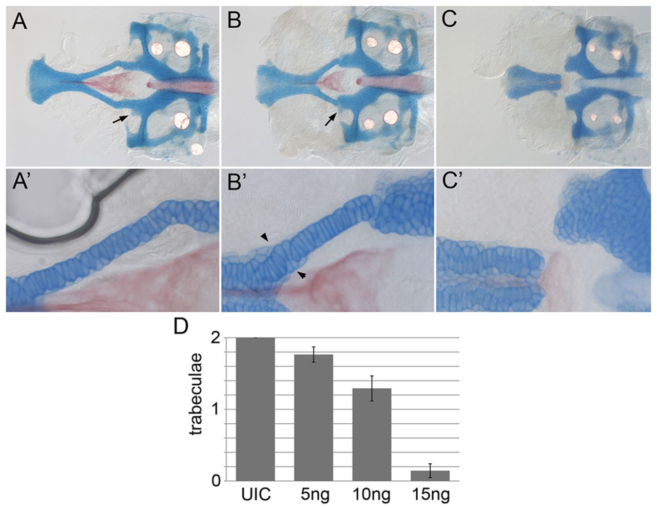 Graded injection of gata3 morpholino recapitulates the background-specific gata3 mutant phenotypes. (A,A2) Uninjected (UIC) embryos have normal neurocrania and trabeculae. (B,B2) Injection of 5 ng gata3 morpholino results in the lateral commissure attaching to the trabeculae (arrow, B) and improper stacking of cells within the trabeculae (arrowheads, B2). (C,C2) Injection of 15 ng of gata3 morpholino causes trabeculae loss. (D) Quantification of the average number of trabeculae/embryo.