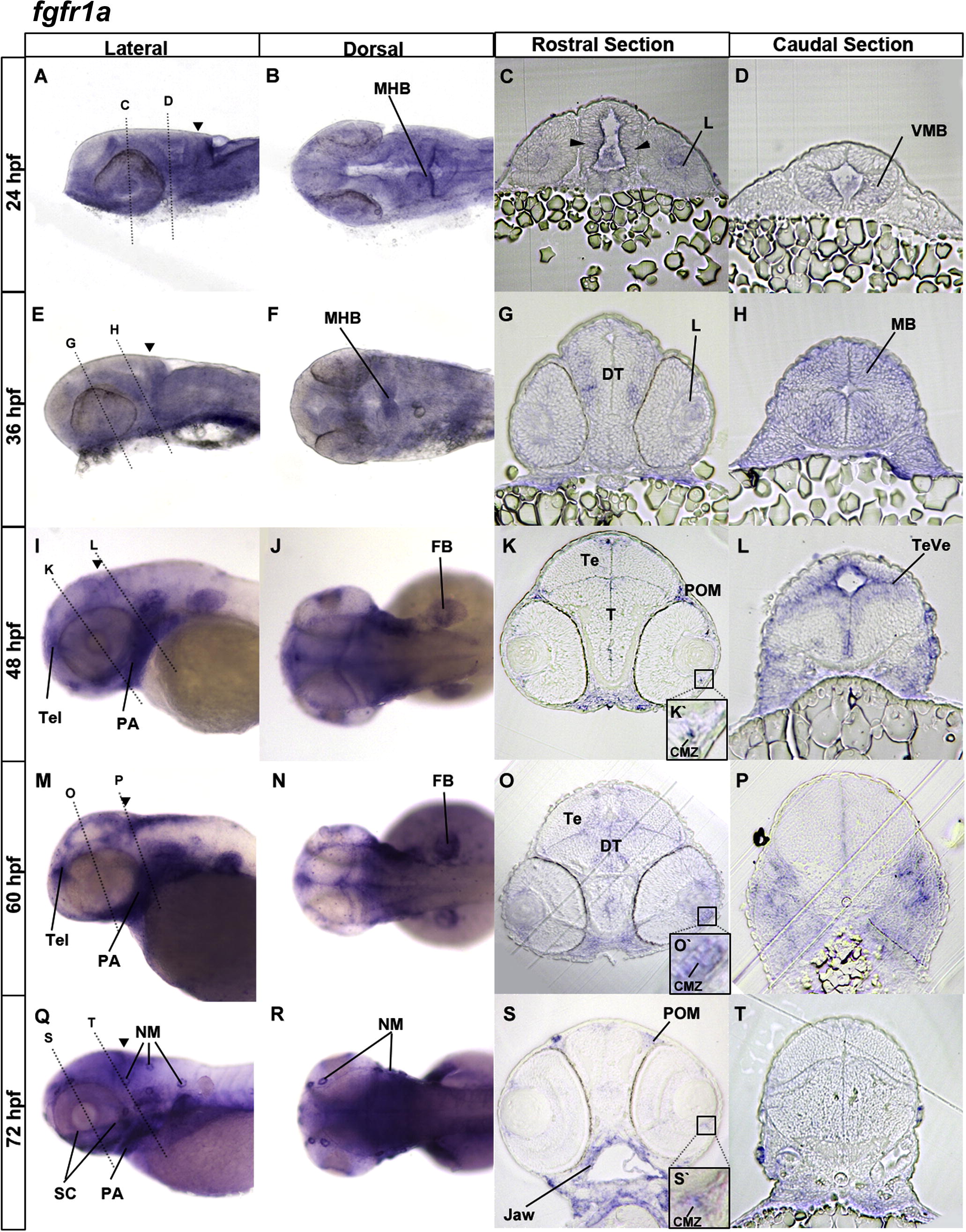 Fig. 1 In situ hybridization of fgfr1a gene expression. In situ hybridization of fgfr1a gene expression at 24 hpf (A–D), 36 hpf (E–H), 48 hpf (I–L), 60 hpf (M–P), and 72 hpf (Q–T). Lateral views (A, E, I, M, Q) with anterior to the left, dorsal at the top, dorsal views (B, F, J, N, R) with anterior to the left, rostral transverse brain sections (C, G, K, O, S), and caudal transverse brain sections (D, H, L, P, T). Dotted lines indicate approximate orientation of imaged sections. Solid arrowheads indicate the location of the midbrain–hindbrain boundary. Arrowheads in C point to weak brain expression. Labels point to expression in the ciliary marginal zone (CMZ), dorsal thalamus (DT), fin bud (FB), jaw (J), lens (L), midbrain (MB), midbrain–hindbrain boundary (MHB), midbrain tegmentum (T), neuromasts (NM), optic tectum (Te), pharyngeal arches (PA), periocular mesenchyme (POM), splanchnocranium (SC), tectal ventricle (TeVe), telencephalon (Tel), and ventral midbrain (VMB).