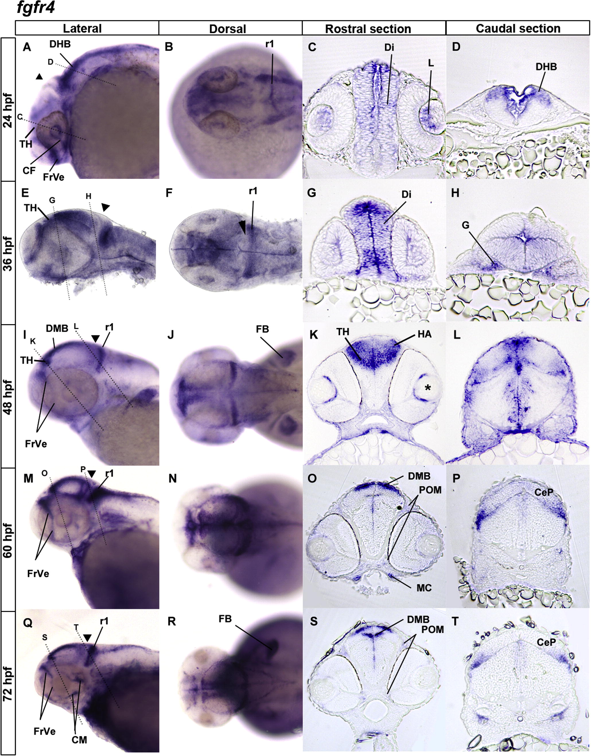Fig. 5 In situ hybridization of fgfr3 gene expression. In situ hybridization of fgfr3 gene expression at 24 hpf (A–D), 36 hpf (E–H), 48 hpf (I–L), 60 hpf (M–P), and 72 hpf (Q–T). Lateral views (A, E, I, M, Q) with anterior to the left, dorsal at the top, dorsal views (B, F, J, N, R) with anterior to the left, rostral transverse brain sections (C, G, K, O, S), and caudal transverse brain sections (D, H, L, P, T). Dotted lines indicate approximate orientation of imaged sections. Solid arrowheads indicate the location of the midbrain–hindbrain boundary. Labels point to expression in the diencephalon (Di), hypothalamus (H), hindbrain (HB), fin bud (FB), forebrain ventricular zone (FrVe), lens (L), mandibular cartilage (MC), midbrain (MB), periocular mesenchyme (POM), rhombomere boundaries (RhB), rhombomere 1 (r1), retinal pigment epithelium (RPE), spinal cord (SC), splanchnocranium (SCr), and vagal ganglion (VG).