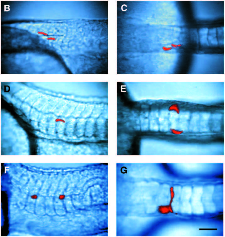 Fig. 7 The fate of cells from the notochord domain in flh and ntl mutant embryos. (A) Map of the cells labeled in flh mutant embryos which gave rise to muscle. 10 of these cells fall within the boundary of the notochord domain. In wild-type embryos, 61 of 71 cells labeled within this boundary gave rise to notochord exclusively. The axes of the graph are as in Fig. 3. (B-E,G) flh and (F) ntl mutant embryos during the early pharyngula period, containing clones of cells derived from single labeled cells in the notochord domain of the gastrula. Side (B) and dorsal (C) views of a unilateral clone of muscle cells in a flh embryo. Side (D) and dorsal (E) views of a bilateral muscle clone in a flh embryo. (F) Side view of a clone of axial mesenchymal cells derived from a notochord domain cell in a ntl embryo. (G) Dorsal view of a clone containing a cell that spanned the midline in a flh embryo. Scale bar, 50 μm.