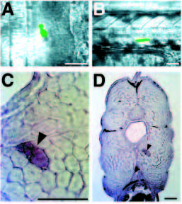 Fig. 9 Lateral presomitic cells become fast muscle fibers. (A) Dorsal view of the segmental plate of an approximately 15.5 h embryo (13 somites), after injection of lateral presomitic cells with lysinated fluorescein dextran. (B) Side view of the same embryo at about 38 h of development. One of the lateral presomitic cells developed into a ventral muscle fiber located in somite 15. (C) Transverse section of the same embryo at 15 d. The injected lateral presomitic cell developed into a large diameter muscle fiber (arrowhead) located deep in the muscle. (D) Lower magnification view of the injected cell (arrowhead). The muscle fiber is within the fast muscle region. In a series of similar experiments, 3 out of 3 injected lateral presomitic cells became fast muscle fibers. In dorsal views, anterior is up; in side views, anterior is to the left; in transverse sections, dorsal is up. Scale bars, 50 μm.