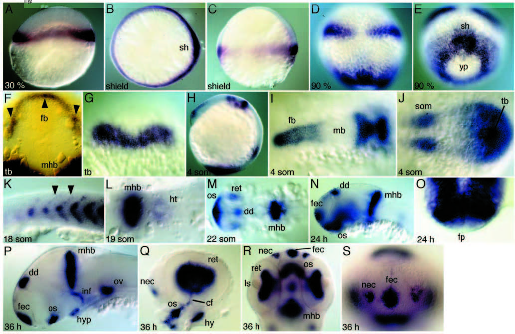 Fig. 2 Expression of Fgf8 in wild-type embryos. (A) Fgf8 in the blastoderm margin at 30% epiboly. (B,C) At shield stage, Fgf8 is expressed in a dorsoventral gradient in the germ ring with a high point of expression in the shield (B, vegetal pole view; C, lateral view). (D,E) Graded expression persists in the margin of the blastoderm at 90% epiboly. Prospective anterior hindbrain expresses Fgf8 (D, dorsal view; slightly tilted in E). (F) Forebrain expression in a tailbud stage embryo (arrowheads point to high points of expression). (G) Prospective MHB domains fuse at the midline at tailbud stage. (H) 4-somite stage, lateral view. Expression in forebrain, mid-hindbrain region, segmental plate and tailbud. (I,J) Flat mount of H, depicting anterior and posterior expression domains. (K) Fgf8 expression at the anterior somite border (arrowheads). (L) Flat-mounted 19-somite embryo. Expression in the heart ring posterior to the MHB. (M) Flat mount at 22 somites; expression in the brain is detected at the MHB, dorsal diencephalon, retina and optic stalks. (N) Lateral view of a 24 hours embryo. Additional expression occurs in the facial ectoderm. (O) Thick cross section through the MHB demonstrating absence of expression in floorplate. (P) Lateral view of a dissected brain at 36 hours of development. Additional expression in the infundibulum, hypophysis and otic vesicle (eyes are removed). (Q) Details of expression in the retina, choroid fissure and the optic stalks. Additional expression is detected in nasal ectoderm and the hyoid. (R) Ventral view of head at 36 hours demonstrating expression in the retinal epithelium, but not in the lens. (S) Frontal view, expression in the facial and nasal ectoderm. cf, choroid fissure; dd, dorsal diencephalon; fb, forebrain; fec, facial ectoderm; fp, floorplate; ht, heart; hy, hyoid; hyp, hypophysis; inf, infundibulum; ls, lens; mb, midbrain; mhb, mid-hindbrain boundary; nec, nasal ectoderm; os, optic stalks; ov, otic vesicle; ret, retina; sh, shield; som, somites; tb, tailbud, yp, yolk plug.