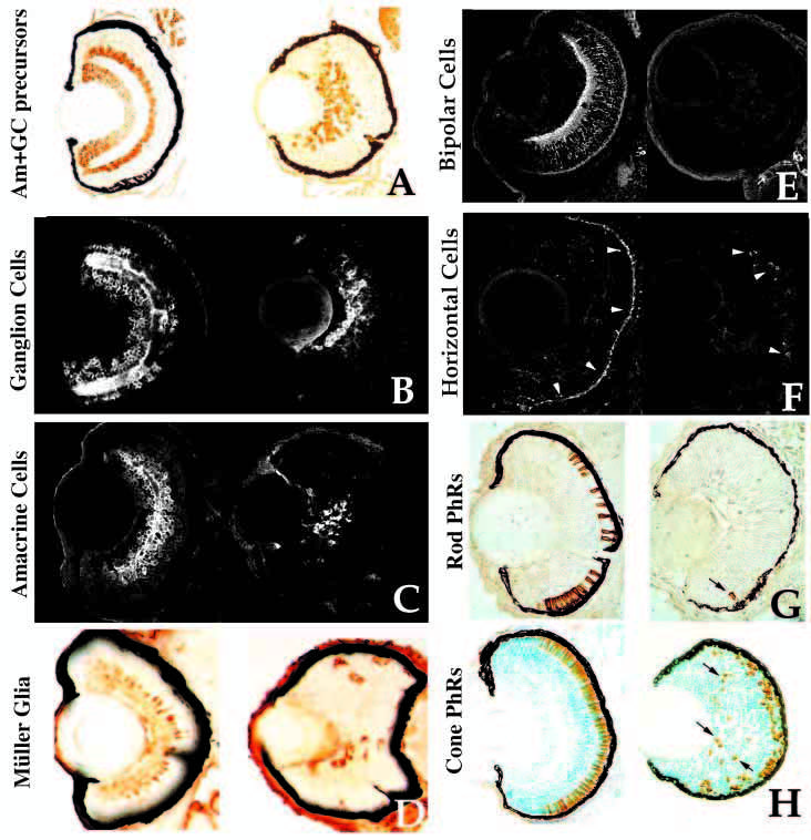 Fig. 3 Retinal cell type marker analysis in young mutants. Central, transverse retinal sections of wild-type (left) and young mutant (right) siblings assessed for celltype- specific markers (see Text and Table 1 for details). (A) Hu antigen (ganglion and amacrine cells and their precursors), 3 dpf. (B) 7A11 antigen (ganglion cells and their axons), 3 dpf. (C) 5E11 antigen (amacrine cells and their processes), 3 dpf. (D) Carbonic anhydrase II immunoreactivity (Muller glial cells), 4 dpf. Carbonic anhydrase II is also expressed in non-ocular ectoderm. (E) Protein kinase C immunoreactivity (bipolar cells and processes), 4 dpf. (F) HCII. 7 immunoreactivity (arrowheads) (horizontal cells and their processes), 3.5 dpf. (G) ID1 antigen (rod photoreceptors), 4 dpf. Arrow indicates rod cell in the ventral patch of a mutant. (H) Zn-1 antigen (red and green cone photoreceptors], 4 dpf. Arrows indicate ectopic, mispatterned photoreceptors in the young retina.
