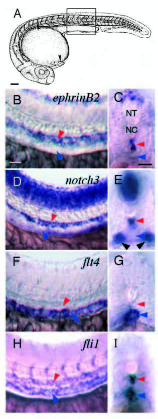 Fig. 1 In situ hybridization of 30-somite stage wild-type embryos using markers of arterial-venous specification. (A) Line drawing of a 30-somite stage embryo. The boxed region corresponds to the area shown in B,D,F and H (modified from Kimmel et al., 1995). (B,D,F,H) Lateral views of (B) ephrinB2, (D) notch3, (F) flt4 and (H) fli1 expression in the trunk vessels. (C,E,G,I) Thick sections (~35-50 mm) through the trunk of embryos showing expression of (C) ephrinB2, (E) notch3, (G) flt4, and (I) fli1. (B-I) The dorsal aorta (DA) is indicated by a red arrowhead and the posterior cardinal vein (PCV) by a blue arrowhead. (E) Pronephric duct expression of notch3 is indicated by black arrowheads. NT, neural tube; NC, notochord. Scale bars, (A) 100 μm, (B,D,F,H) 40 μm, (C,E,G,I) 30 μm.