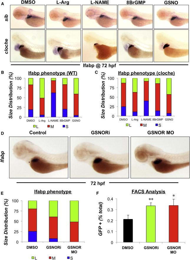 (E) Phenotype analysis of liver size in GSNOR-deficient embryos at 72 hpf as determined by in situ hybridization for lfabp (n > 25 embryos per treatment).