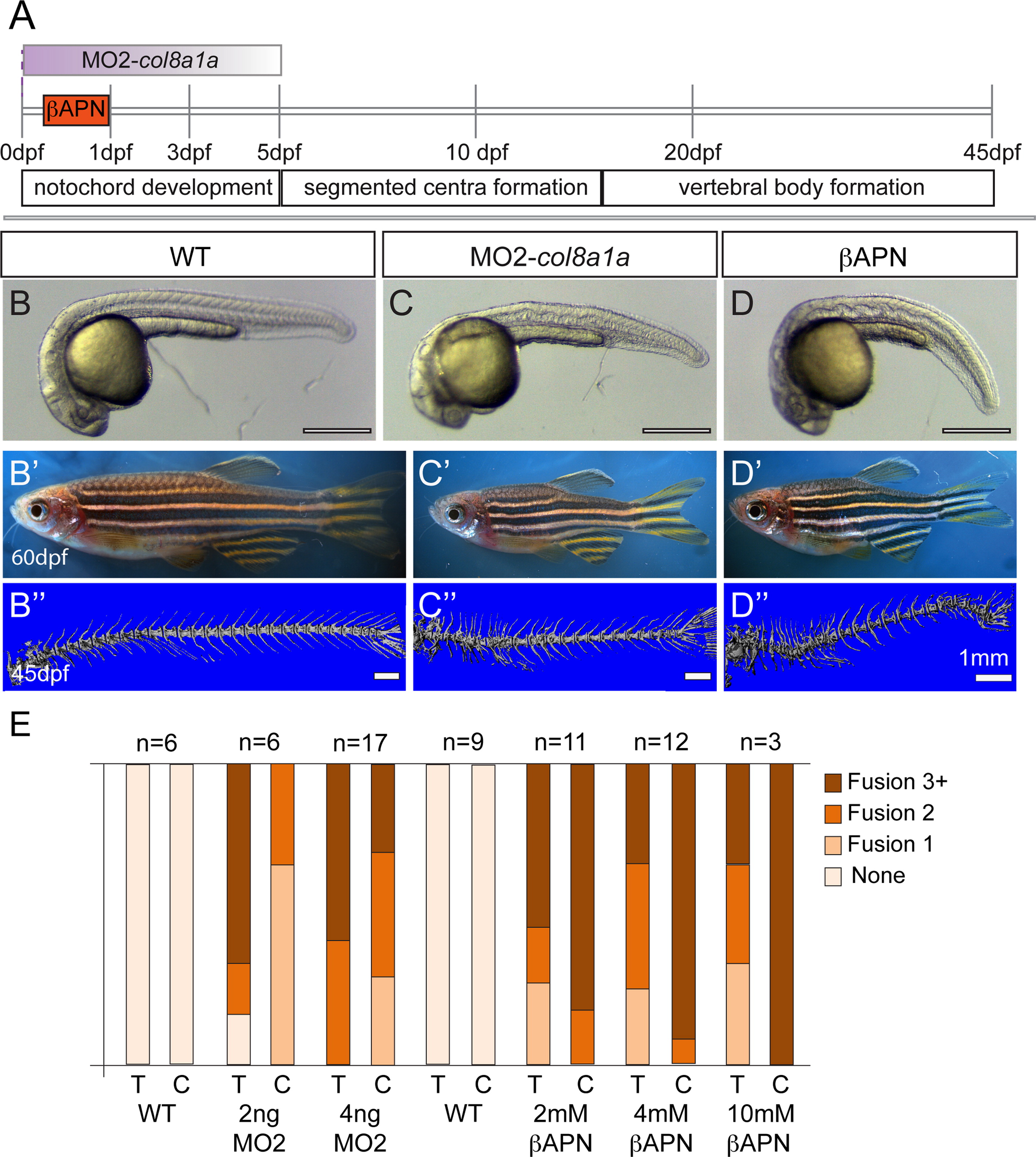 Embryonic inhibition of col8a1a function or lysyl oxidases is sufficient to generate vertebral defects. (A) Timeline of vertebral column development in zebrafish. In one experiment, the injection of MO2-col8a1a at the 1-cell stage, is effective in blocking the splicing of col8a1a until~3–5dpf (purple gradient bar) (C–C′′). In the second experiment the lysyl oxidases inhibitor, βAPN, is added at 4hpf and washed out at 1dpf (orange bar) (D–D3). Both treatments completed well before the onset of centra formation started in the anterior regions at 5dpf. Representative brightfield images of 1dpf (B, C, and D) and 60dpf (B′, C′, D′) and microCT images (45dpf) (B′′, C′′, D′′) of WT (B–B′′), MO2-col8a1a injected (C–C′′), and βAPN pulsed adult zebrafish (D–D′′). (D) Categorical frequency of VM for 2 and 4 ng MO2-col8a1a morpholino injected adults and uninjected WT siblings and 2, 4, and 10 mM βAPN treated adults and DMSO treated sibling controls for both thoracic (T) and caudal (C) regions. Scale bars for (B, C, and D)=4 mm, (B′, C′, D′)=5 mm, and (B′′, C′′, D′′)=1 mm.