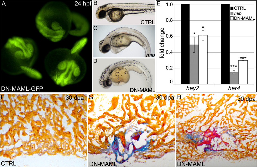 Heat shock inducibility of DN-MAML-GFP, suppression of Notch signaling by DN-MAML-GFP, and cardiac regenerative deficiencies in an independent Tg(hsp70:DN-MAML-GFP) line. (A) Embryos carrying the Tg(hsp70:DN-MAML-GFP)fb10 transgene were heat shocked for 30 min at 37 °C following gastrulation (bud stage). At 24 hpf, these embryos exhibited prominent GFP fluorescence indicating DN-MAML-GFP protein expression. (B–E) Heat-shock-inducible suppression of Notch signaling in Tg(hsp70:DN-MAML) animals. Control (CTRL) and Tg(hsp70:DN-MAML) embryos were heat shocked at bud stage (B and D) or 19 hpf (E) and analyzed for gross morphological defects at 48 hpf (B and D) or relative expression of Notch target genes hey2 and her4 by qPCR at 24 hpf (E). Mind bomb (mib) mutant embryos, which are devoid of Notch signaling, were analyzed in parallel. Whereas control embryos were unaffected by heat shock (B), mib (C), and heat shocked Tg(hsp70:DN-MAML) (D) embryos displayed similar body axis curvature defects. (E) Graph showing the relative expression levels of hey2 and her4 transcripts in each experimental group. Three biological replicates were included in the qPCR analysis. Data are presented as means ± 1 SD, *P < 0.05; ***P < 0.001. (F–H) AFOG staining of representative cardiac sections at 30 dpa from heat shocked control (CTRL; F) and transgenic adults carrying an independent insertion of the Tg(hsp70:DN-MAML-GFP) transgene [Tg(hsp70:DN-MAML-GFP)fb11] (G and H). Similar to Tg(hsp70:DN-MAML)fb10 hearts, heat shocked Tg(hsp70:DN-MAML)fb11 hearts displayed prominent regenerative deficiencies as evidenced by fibrin retention (red) and collagen deposition (blue). Sections shown in G and H are from independent animals. Cardiac regeneration failed in 0 of 8 heat shocked control hearts and 5 of 5 heat shocked DN-MAMLfb11 hearts.