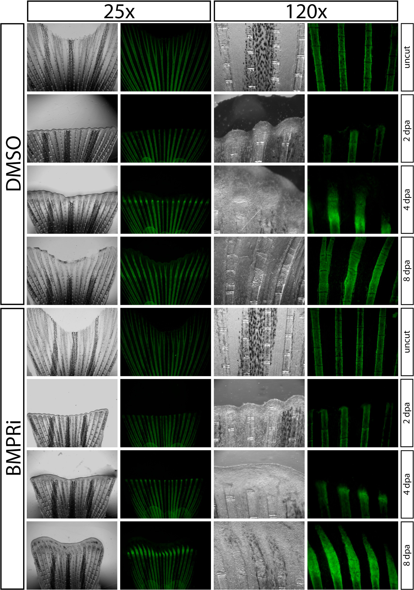 BMP receptor signaling is required for regeneration. Regeneration of caudal fins from Tg(sp7:EGFP) animals exposed to DMSO (upper panels) or BMPRi (lower panels, 5 μM at 0-8 dpa). Images show the progression of regeneration in an individual fish before amputation and at 2, 4, and 8 dpa using Rotterman contrast and epifluorescence to visualize sp7:EGFP expression (green) in osteoblasts at 25x and 120x magnification. One of three fish, which all behaved similarly, from the two treatment groups are shown. The experiment was repeated using three independent sets of animals.