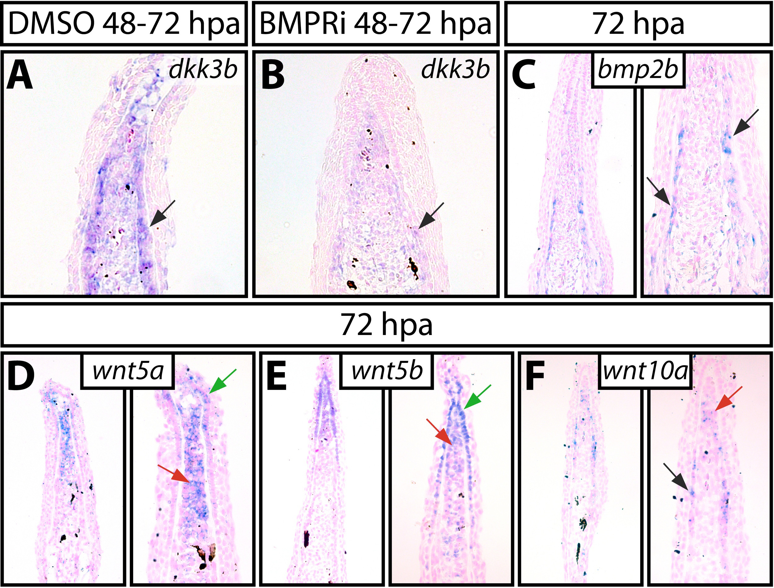 (A and B) In situ hybridization using a dkk3b probe on 72 hpa fins from control (A, DMSO 48- 72 hpa) and BMPRi (B, 5 μM, 48-72 hpa) treated fish. (C-F) Expression of bmp2b (C), wnt5a (D), wnt5b (E), and wnt10a (F) by in situ hybridization on paraffin sections from 72 hpa fin, shown at low and high magnification. The black arrows indicate osteoblasts, red arrows point to distal blastema mesenchymal cells, and green arrows mark basal epidermal cells.