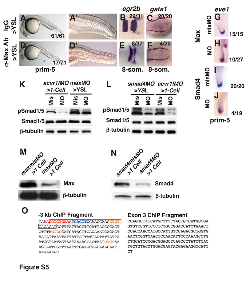 Embryos injected into the YSL with 150pg IgG (A-C), 150pg anti-Max antibody (D-E), 8ng maxmisMO (G, K, M), 8ng maxMO (H, K, M), 4ng smad4misMO (I, L, N) or 4ng smad4MO (J, L, N). (A, A′, D, D′) Image of live embryo at prim-5 (24 hpf). (B, E) egr2b expression at the 8- somite stage. (C, F) gata1 expression at the 8-somite stage. (G, H, I, J) eve1 expression in the tailbud at the prim-5 stage. Arrowhead indicates ectopic tailbud. (K) Western Blot of extracts of embryos at 75% epiboly acvr1lMO>1-cell morphants, maxMO>YSL morphants or controls. In acvr1lMO>1-cell morphants, pSmad1: 25% ± 8.6 S.D. of controls; pSmad5: 21.25% ± 4.7 S.D. of controls; In maxMO>YSL morphants, pSmad1: 56% ± 6.3 S.D. of controls, pSmad5: 70% ± 7.0 S.D. of controls. (L) Western Blot of extracts of embryos at 75% epiboly acvr1lmisMO>1-cell morphants, smad4MO>YSL morphants, or controls. In acvr1lMO>1-cell morphants, pSmad1: 25% ± 8.6 S.D. of controls; pSmad5: 21.25% ± 4.7 S.D. of controls; In smad4MO>YSL morphants, pSmad1: 23% ± 3.5 S.D. of controls, pSmad5: 35% ± 0.7 S.D. of controls. (M) Western blot of maxMO>1-cell morphants or controls. Max protein: 19.7% ± 7.3 S.D. of controls. (N) Western blot of extracts of 8hpf smad4MO>1-cell morphants or controls. Smad4 protein: 20% ± 2.1 S.D. of controls. (O) The sequences of the amplicons assayed in Fig. 7A. Consensus Tbox site is in red; consensus E-box site is blue; potential Smad binding sites are orange. Anterior is to the left in (A-F), to the top in (G, H, I, J). For Western blots, 15μg total protein loaded in each lane.