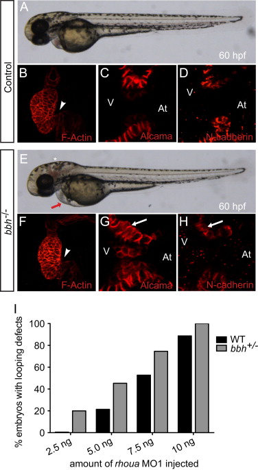 Fig. 5 Arhgef7b is required to localize N-cadherin and Alcama to the cell junctions. (A, E) Brightfield microscopy showed that (E) the arhgef7b mutant, bubblehead (bbh), exhibited cardiac edema (red arrow) and cranial hemorrhaging (asterisk) by 60 hpf. (B, F) Confocal projections of 60 hpf control wild-type sibling and bbh mutant phalloidin stained (F-actin) hearts revealed that bbh mutant hearts failed to undergo proper cardiac looping and displayed AV canal defects. White arrowhead points to AV canal. (C, D, G, H) Immunohistochemical staining of control and bbh mutant hearts at 60 hpf using (C, G) Alcama and (D, H) N-Cadherin antibodies, revealed mislocalization of Alcama and N-cadherin in bbh mutant AV cardiomyocytes (G, H – white arrow). At – atrium, V – ventricle. (I) bbh/arhgef7b genetically interacts with rhoua. Cardiac edema and AV canal defects were observed more frequently in bbh +/ embryos than in wild-type embryos upon increasing titrated doses of rhoua MO1. (WT+2.5, 5, 7.5, 10 ng MO1 – 0%, 21.4%, 52.7%, 88.7% cardiac phenotype and arhgef7b+/m292+2.5, 5, 7.5, 10 ng MO1 – 15.4%, 37.5%, 78.9%, 100% cardiac phenotype).
