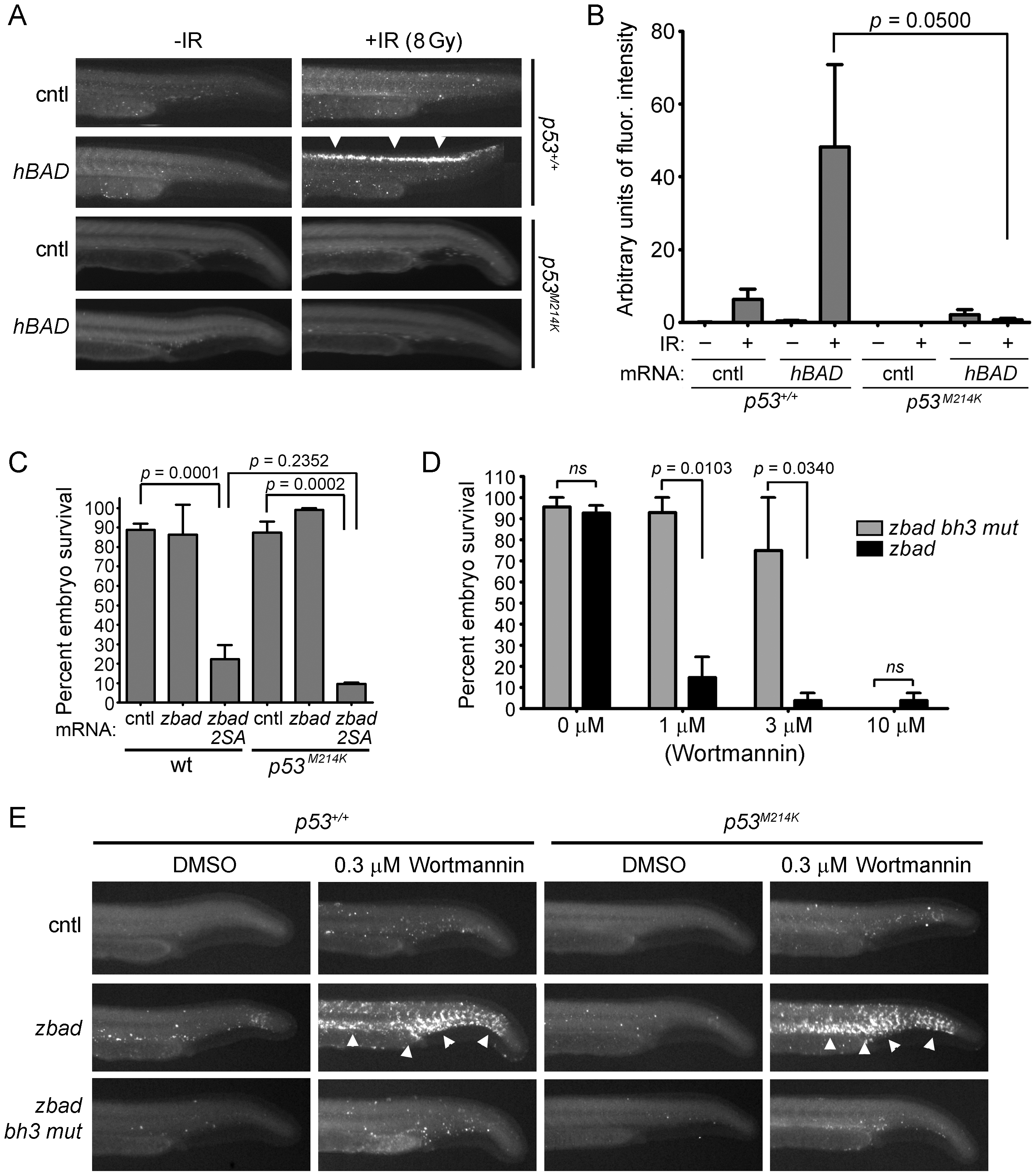 (A) Shown are lateral views of representative tails from 27-hpf wild-type or p53 mutant embryos injected with 50 pg of mcherry (cntl) or hBAD mRNA. Embryos were exposed (or not) to 8 Gy IR at 24 hpf and analyzed three hours later by the Casp3 assay. Apoptosis was observed in the spinal cord after hBAD mRNA was injected into wild-type (arrowheads), but not mutant, p53 embryos. (B) Fluorescence intensity was measured in the spinal cords of at least 10 embryos from each group in (A). Data represent one experiment, but the experiment was independently performed three times with similar results. (C) One-cell stage wild-type or p53 mutant embryos were injected with 50 pg of mRNA encoding either mcherry control (cntl) or the constitutively active mutant zbad 2SA. At 8 hpf, embryos were analyzed for survival (defined by a beating heart) as performed previously [34]. Data represent one experiment, but the experiment was independently performed three times with similar results. (D) One-cell stage wild-type embryos were injected with 50 pg of mRNA encoding either zebrafish bad or the apoptotically-inactive zbad bh3 mut. At 8 hpf, embryos were treated with increasing concentrations of wortmannin, or DMSO vehicle alone. At 48 hpf, embryos were examined for survival. At least 10 embryos were analyzed per group in three independent experiments. E) Shown are lateral views of tails from p53 wild-type (left) or mutant (right) embryos after injection with 25 pg of mRNA encoding either mcherry (cntl), zbad, or zbad bh3 mut. Embryos were split into two groups and treated with either 0.3 μM wortmannin or DMSO vehicle beginning at 8 hpf and analyzed at 24 hpf by the Casp3 assay. Wild-type Bad synergizes with wortmannin to induce apoptosis in multiple tissues in a p53-independent manner (arrowheads).