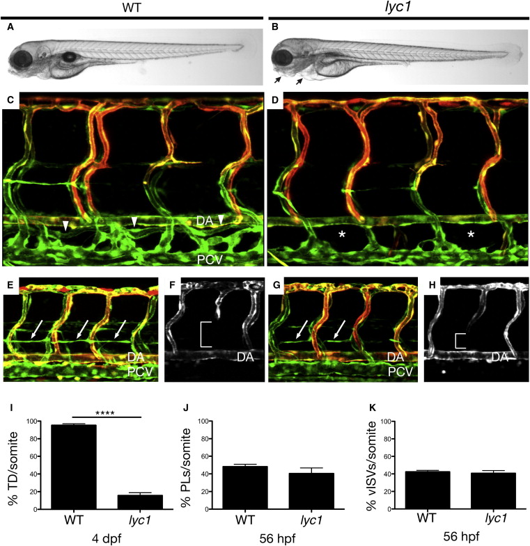 (C and D) The vasculature Tg(fli1a:EGFPy1; flt1:tomatohu5333Tg) of (C) wild-type (WT) (arrowheads indicate thoracic duct) and (D) lyc1 mutants at 4 dpf (asterisks indicate absence of thoracic duct).