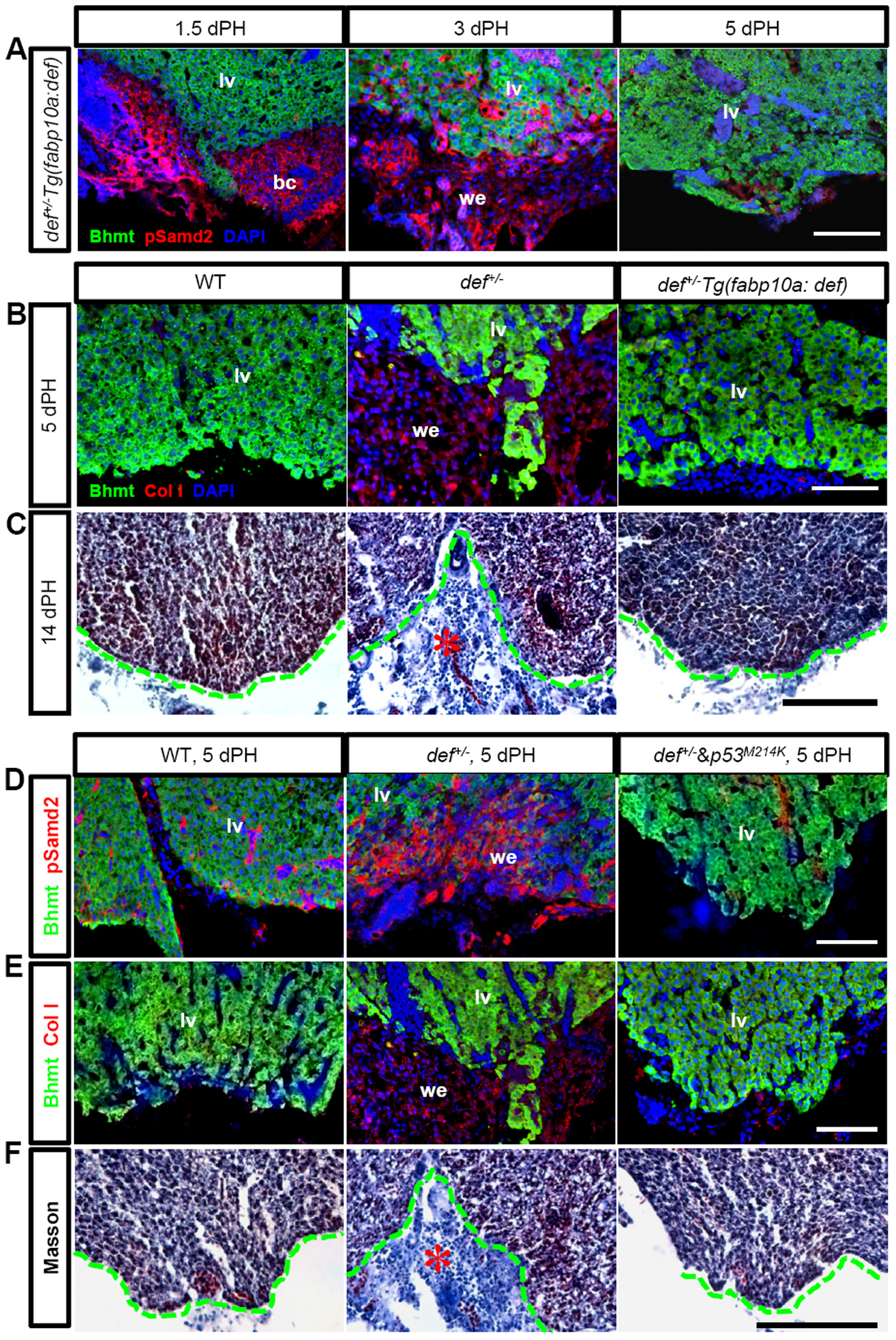 (A) Immunostaining of pSmad2 (red) and Bhmt (green) in the wound dermis in def+/-Tg(fabp10:def)+/- progeny 1.5, 3 and 5 days after PH, respectively. (B) Immunostaining of ColI (red) and Bhmt (green) in the wild-type, def+/- and def+/-Tg(fabp10:def)+/- progeny 5 days after PH. (C) Masson staining of the amputation site (indicated by a green dashed line) in the wild-type, def+/- and def+/- Tg(fabp10:def)+/- progeny 14 days after PH. (D,E) Immunostaining of pSmad2 (red) and Bhmt (green) (D) and of ColI (red) and Bhmt (green) (E) in the wound epidermis in the wild-type, def+/- and def+/-p53M214K/M214K 5 days after PH. (F) Masson staining of the amputation site in the wild-type, def+/- and def+/-p53M214K/M214K progeny 14 days after PH. Fibrotic tissue in the def+/- fish is highlighted by a red asterisk. In (A,B,D,E), nuclei were stained with DAPI (blue). In each case, more than 10 sections from at least three wild-type or def+/- mutant fish were examined. Representative images are shown here. bc, blood clot; lv, liver tissue; we, wound epidermis. Scale bars: 150 μm (C,F) and 75 μm (A,B,D,E).