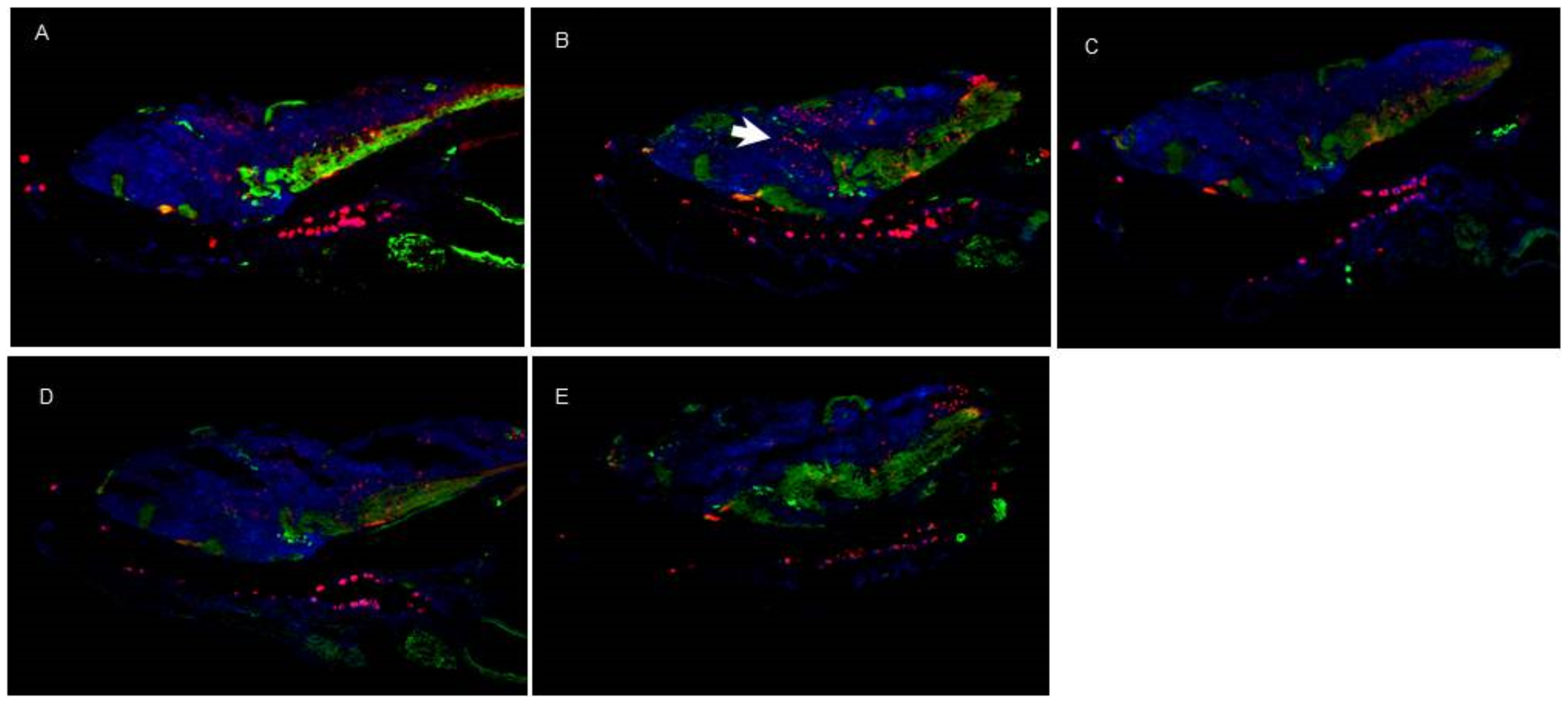 Tyrosine hydroxylase, labeled with Cy2 (green), and Calretinin, labeled with Cy3 (red). A) control, B) risperidone (Risp) at 4 dpf, C) Risp at 6 dpf, D) DG4.5-Risp at 4 dpf, and E) DG4.5-Risp at 6 dpf. Larvae were analyzed three times (n = 3) at 10 dpf.