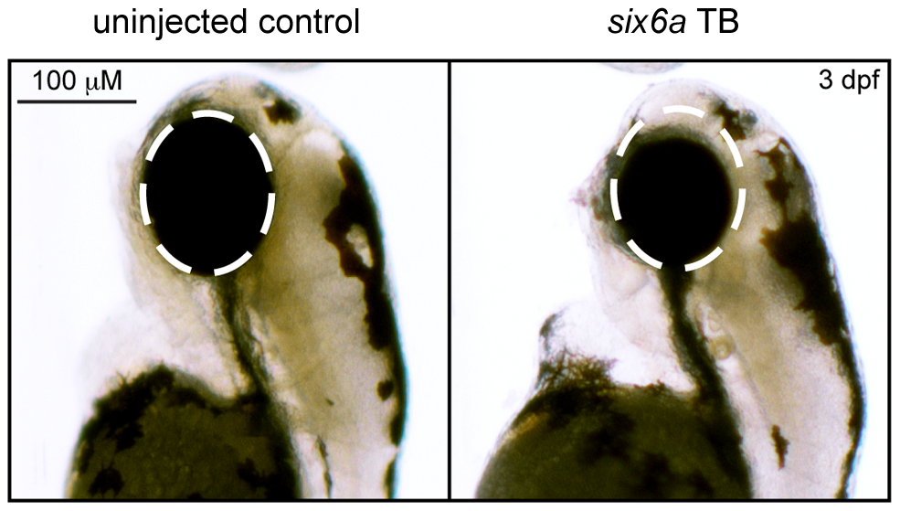 Zebrafish were microinjected with a six6a translation blocking morpholino. Lateral images, taken 3 days post fertilization (3 dpf), of a wild-type zebrafish (left) and a morpholino injected zebrafish (right) are shown, highlighting the small eye phenotype (dashed circle).