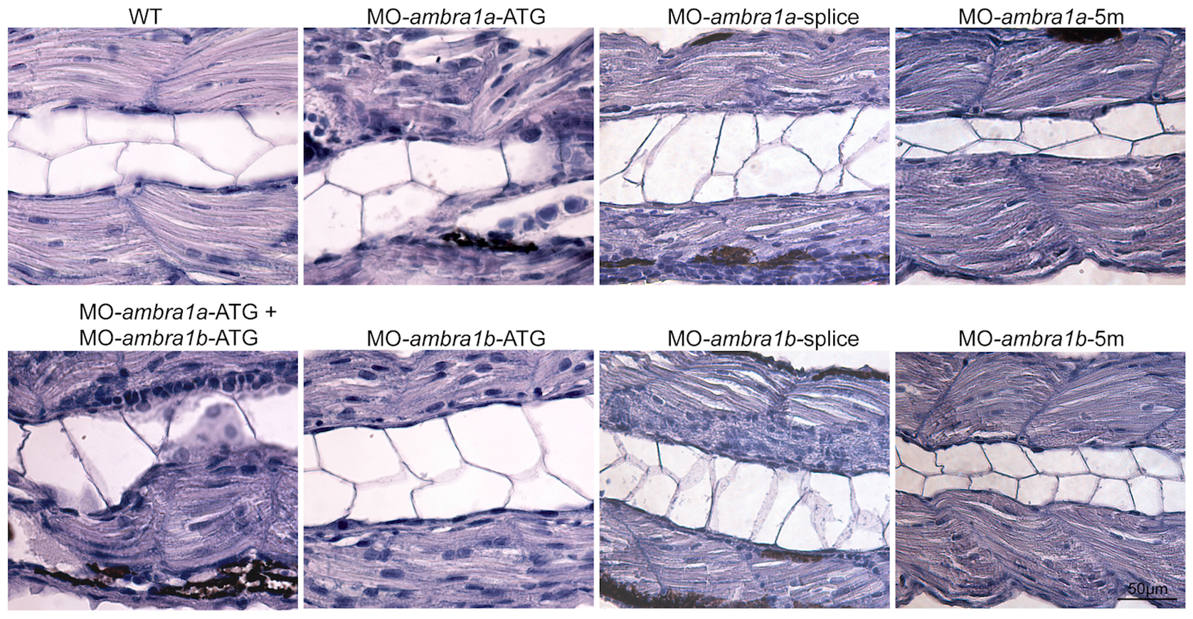 Representative longitudinal sections of 3 dpf control and ambra1 morphant embryos. Myofibers of ATG- and co-injected morphants muscles are highly disorganized and display irregular myosepta boundaries. The phenotype of splice-morphants is much less severe when compared to WT and 5 m-control embryos.