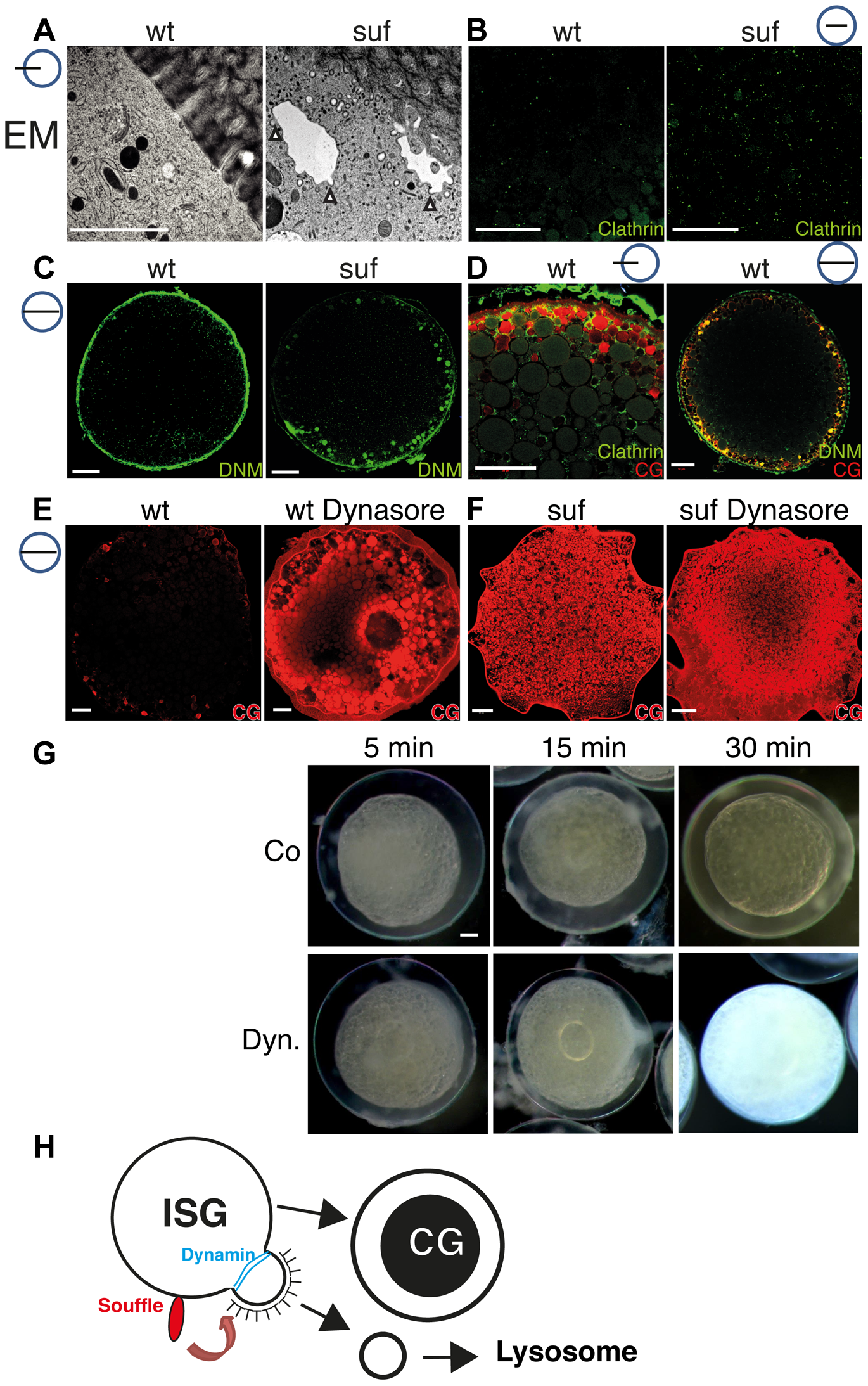 (A) Electron micrographs of high-pressure frozen stage III oocytes. Cisternae with Clathrin coated buds accumulate in suf/spastizin oocytes (white arrowheads). Scale bar: 0.5 μm. (B–D) Stage III oocytes labeled with Clathrin (green; B, D) Dynamin (green; C, D) or MPA lectin (red; D). Clathrin and Dynamin localize to a subset of cortical granules. Note the accumulation of Dynamin on vesicles at the cortex in suf/spastizin oocytes (C). (E, F) Dynasore partially mimics the suf defect. Wt oocytes accumulate the cortical granule marker MPA-lectin (red) after treatment with Dynasore (E) similar to suf mutant oocytes (F). The huge compartment in the center of the Dynasore treated wt oocyte in panel E shows the germinal vesicle (oocyte nucleus). (G) Cortical granules continuously mature after ovulation. Stage V eggs were incubated with carrier (Co: upper row) or Dynasore (Dyn.; lower row) for 5, 15 or 30 min and then activated with H2O. The degree of chorion expansion correlates with Dynasore treatment duration. Note that the complete block of exocytosis also leads to opaque cytoplasm similar to suf mutants. (H) Working model for Souffle (red) function on immature secretory granules (ISG). Suf/Spastizin is necessary for the abscission of Clathrin-coated buds. Whereas the compartment matured into secretory, cortical granules (CG) with a dense-core, the Clathrin-coated vesicles enter the endolysosomal transport route probably to lysosomes.