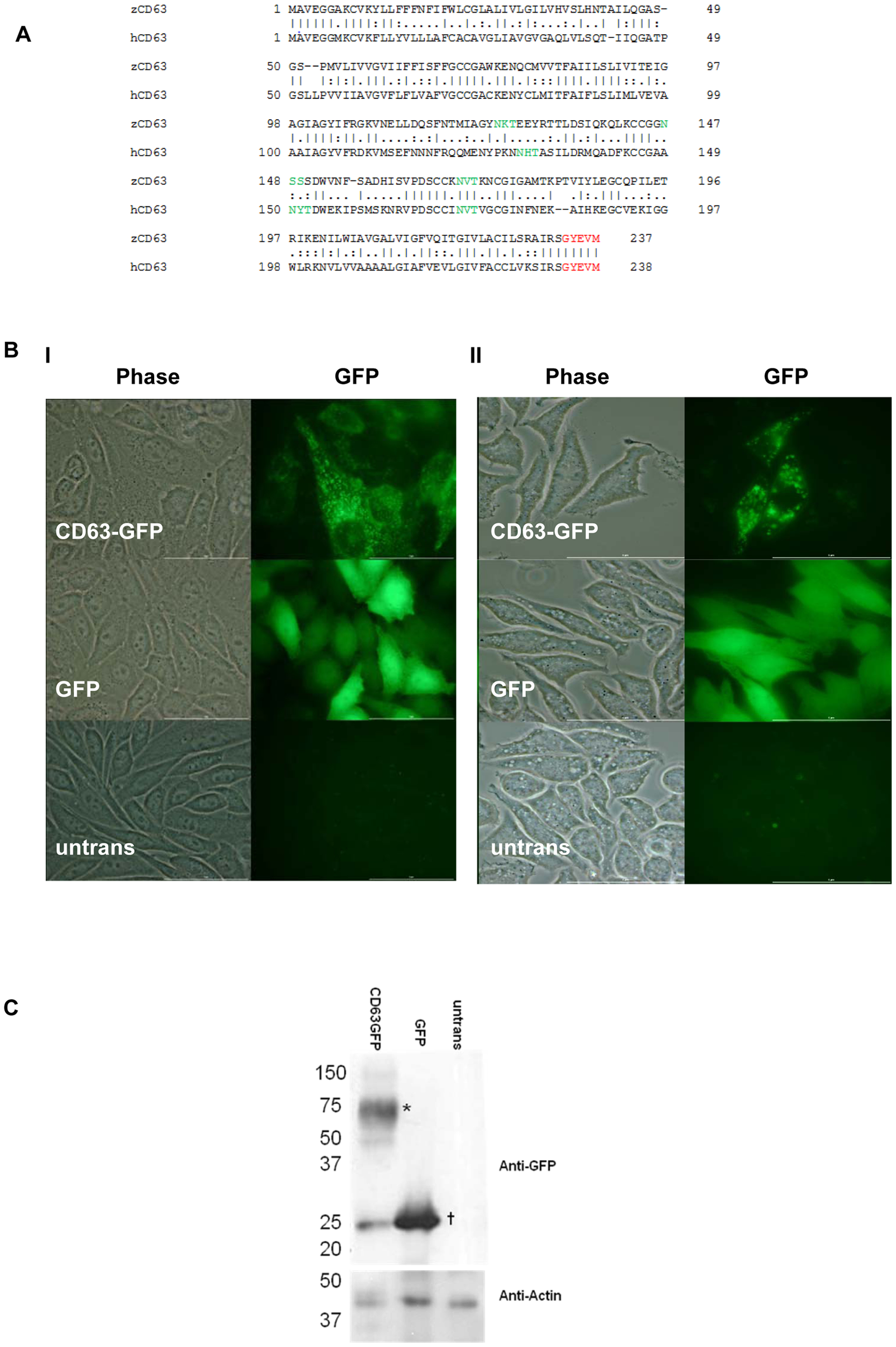 A. Alignment between Homo sapiens (CAG46893) and Danio rerio (NP_955837). Functional motifs are highlighted; glycosylation sites are in green, lysosomal targeting motif in red. BI. CHO (Chinese Hamster ovary) cells, and BII. RBL-2H3 (rat basophilic leaukaemia) cells, transfected with Cd63-GFP, GFP, or untransfected. C. Western blot of lysates from CHO cells probed with anti GFP, with anti actin as a loading control. Ladder positions are indicated on the left in kDa. * denotes Cd63GFP, † denotes GFP.