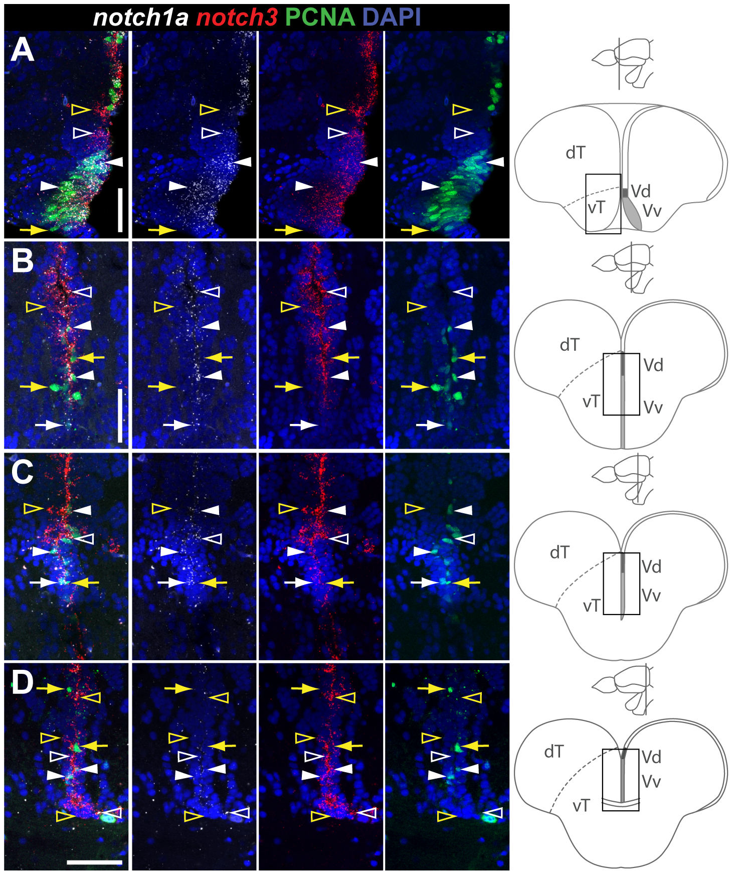 Confocal images showing localization of notch1a (white) and notch3 (red) by double FISH (white and red) and PCNA proliferating cells (green); DAPI (blue) is used as nuclear counterstaining. Areas represented in the micrographs are indicated in the cross-section schematics on the right as well as the different levels through the telencephalon. A-D, notch1a and notch3 expression domains along the rostro-caudal vT proliferation zone. Co-expression of these receptors both in PCNA (white filled arrowheads) and PCNA cells (unfilled white arrowheads); a few PCNA cells are Notch receptor (yellow arrows) while others are notch1a + /notch3 - (white filled arrows); unfilled yellow arrowheads indicate notch1a - /notch3+/PCNA - cells. Abbreviations: dT, dorsal telencephalic area; vT, ventral telencephalic area; Vd, dorsal nucleus of the ventral telencephalon; Vv, ventral nucleus of the ventral telencephalon. Scale bars = 50μm in A, B (applies to C) and D.