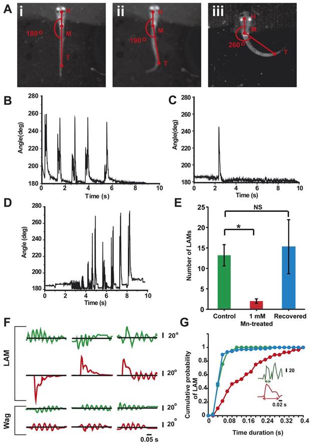 Fig. 3 Altered frequency and duration of trunk movements in Mn-exposed larvae. (A) Still frames from a 20-second movie recorded at 300 fps in a head-embedded larva. The angle between head ‘H’, mid trunk ‘M’ and tail ‘T’ was used as a measure of the extent of trunk movement when the larva was exhibiting (i) a resting state (180°), (ii) wagging (<200°, supplementary material Movie 2) and (iii) large-angle movements (LAM) (>200°, supplementary material Movies 3, 4). The trunk movement angle plotted against time for (B) control larvae, (C) Mn-treated (48-hour exposure to 1 mM MnCl2) and (D) recovered (24-hour recovery following Mn exposure) larvae. (E) Average number of LAMs within a 20-second period plotted for control (n=5), Mn-treated (n=7) and recovered (n=7) larvae. Error bars indicate s.e.m. Statistical analysis was performed by using Wilcoxon rank sum test with Bonferroni correction for multiple comparisons. *P=0.0025; NS, non significant. (F) Stacks of expanded plots of LAMs and short wags in control (green) and Mn-exposed larvae (red). The black line represents the resting position. Angles above the line depict left-directed movements and angles below the line depict right-directed movements. Alternate consecutive left and right LAM patterns, and clusters of unidirectional LAMs were observed in control larvae, whereas Mn-exposed larvae exhibited single LAMs which were not immediately followed by other LAMs. (G) Cumulative probability distribution of LAM durations for control (green), Mn-treated (48-hour exposure, red) and recovered (24 hours in Mn-free medium following Mn exposure, blue) larvae indicating that control and recovered larvae displayed shorter duration LAMs, whereas Mn-treated larvae displayed longer duration LAMs (P<0.0001). Statistical analysis was performed using Kruskal–Wallis ANOVA.