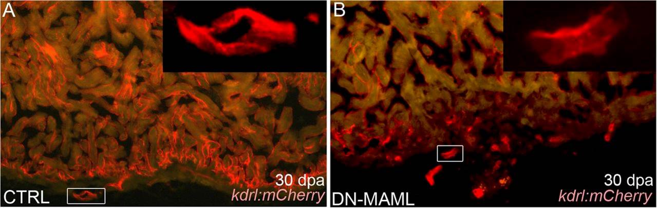 Evidence for regeneration of coronary endothelium in Notch-inhibited hearts. (A and B) Representative cardiac sections from heat shocked control (CTRL) (A) and Tg(hsp70:DN-MAML) (B) animals carrying the Tg(kdrl:mCherry) endothelial reporter at 30 dpa. (Insets) Higher magnification views of boxed regions in A and B. Whereas control animals regenerated mCherry+ endocardium and coronary vessels, Tg(hsp70:DN-MAML) hearts harbored mCherry+ endothelial tubes in the nonregenerated region of the heart. The myocardium is autofluorescent in A and B. Fourteen of 14 control and 11 of 11 Tg(hsp70:DN-MAML) hearts demonstrated these phenotypes.