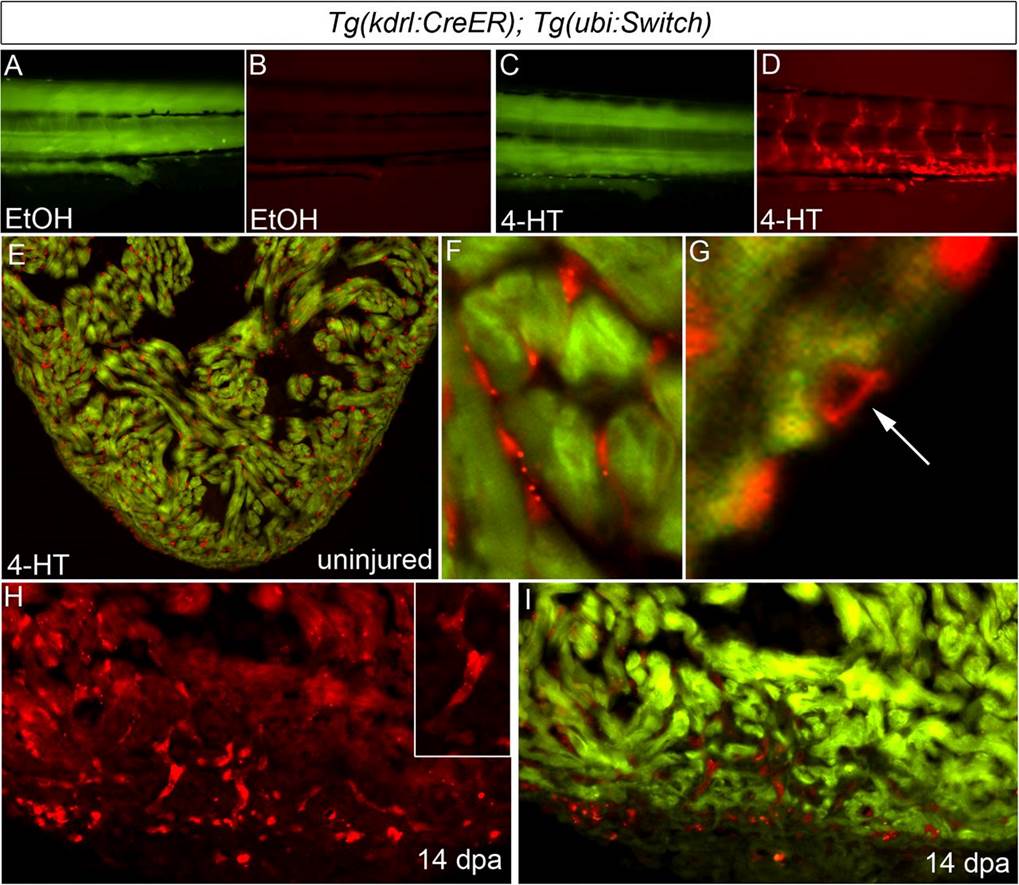 Regenerated coronary endothelium derives from preexisting endothelial cells during zebrafish heart regeneration. (A–D) Permanent labeling of endothelial cells during zebrafish embryogenesis. Tails of 96-hpf Tg(kdrl:CreER); Tg(ubi:Switch) embryos treated between 24 and 48 hpf with EtOH (A and B) or 4-HT (C and D) and imaged in the green (A and C) and red (B and D) channels. All 4-HT–treated embryos examined expressed mCherry in endothelial cells (n > 100), whereas EtOH-treated embryos failed to report red fluorescence (n > 100). (E–G) The adult endocardium and coronary endothelium displayed widespread and permanent mCherry labeling following 4-HT treatment during embryonic stages (n = 3/3). Representative cardiac section (E) and close up views of mCherry-labeled endocardium (F) and coronary endothelium (G). (H and I) Representative cardiac section from a regenerating Tg(kdrl:CreER); Tg(ubi:Switch) animal with mCherry-labeled endocardial and endothelial cells at 14 dpa. Numerous mCherry+ endothelial tubes (Inset) populated the regenerating myocardium. (n = 3/3.)