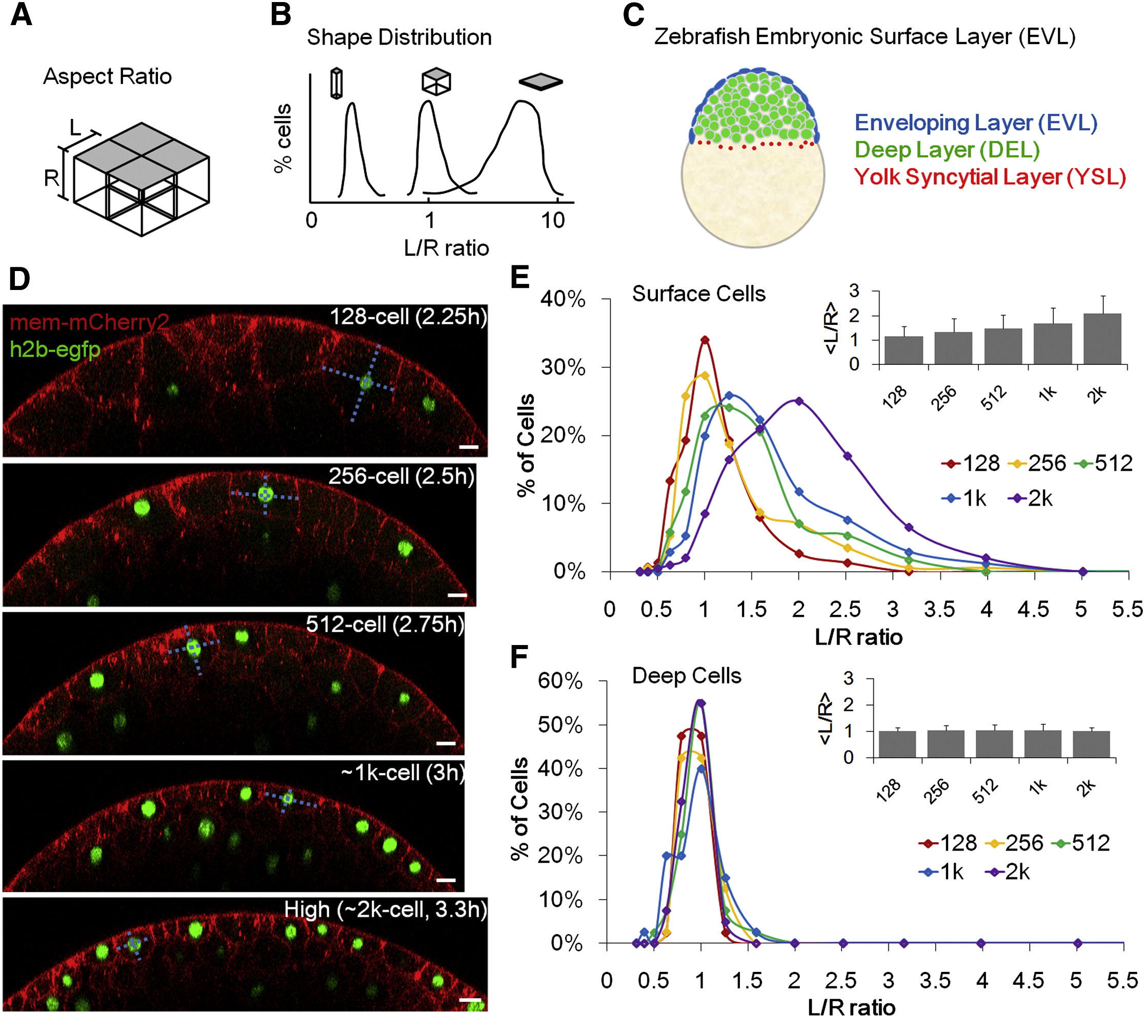(E) Morphogenesis of surface layer over five cell cycles. n = 860. Inset: average L/R ± SD.