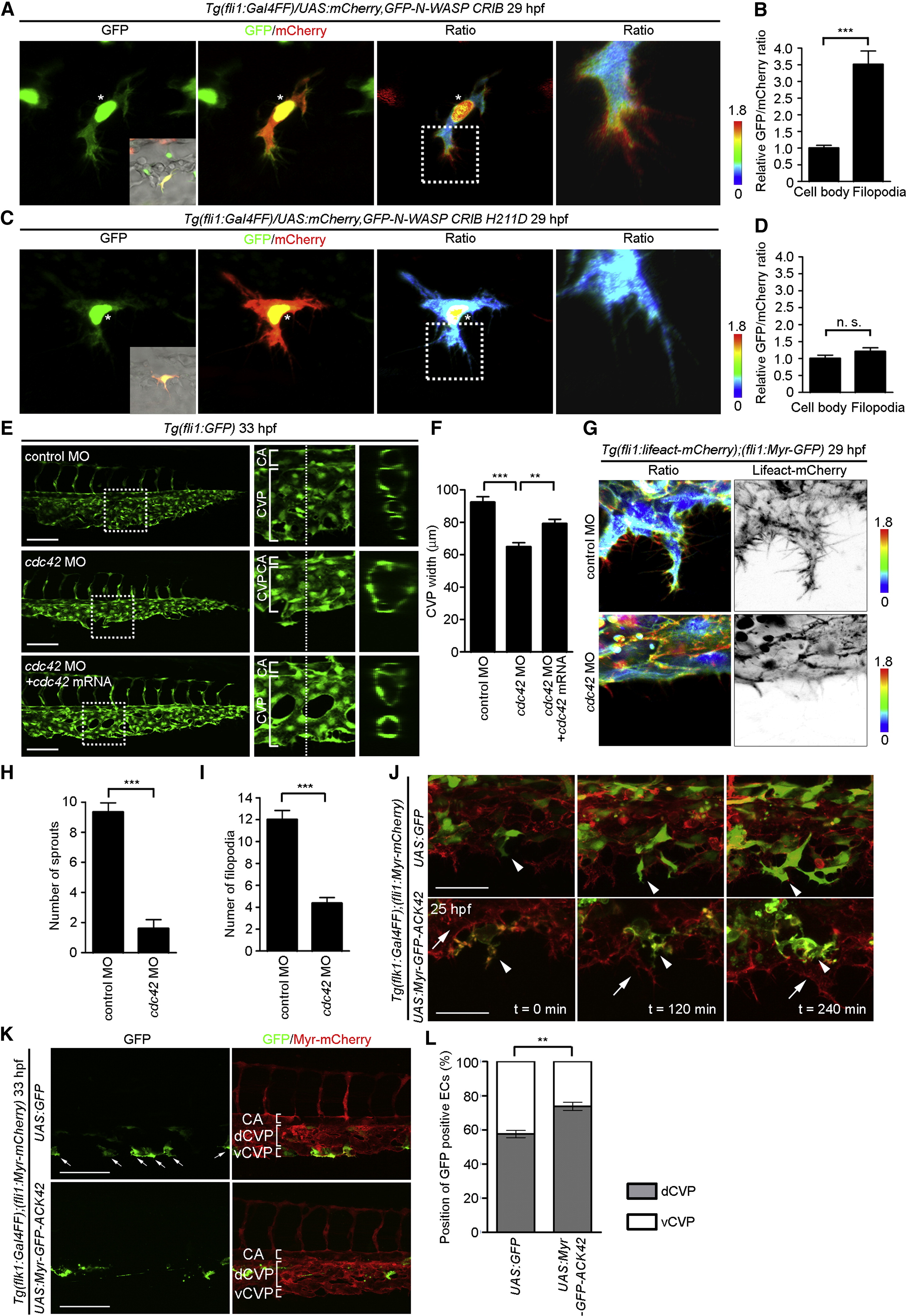 (I) The number of filopodia for each EC located at the vascular front, as observed in (G), was quantified as in Figure 1D (control MO, n = 10; cdc42 MO, n = 11). Error bars indicate means ± SEM.