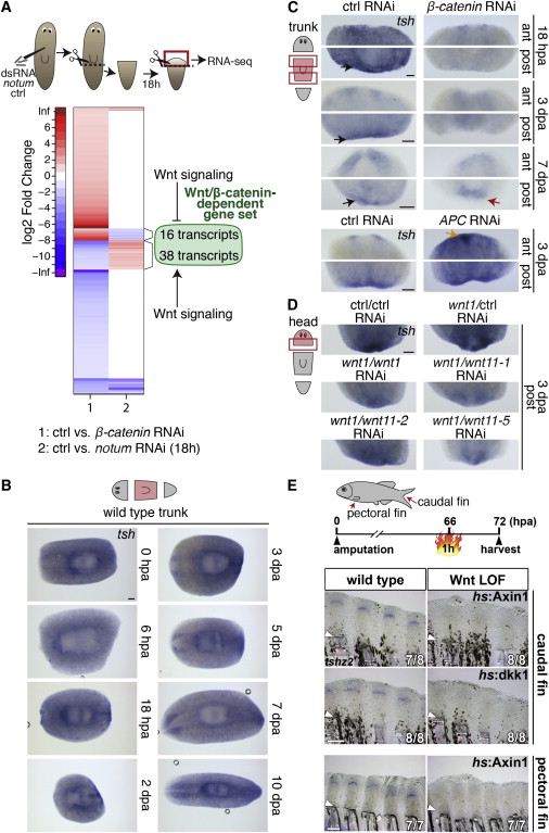 (C) tsh expression at anterior and posterior regeneration sites of ctrl (control) trunk fragments and after β-catenin or APC RNAi at indicated regeneration time points. Black arrow; posterior tsh expression; red arrow: ectopic posterior brain; orange arrow: ectopic anterior tsh expression.