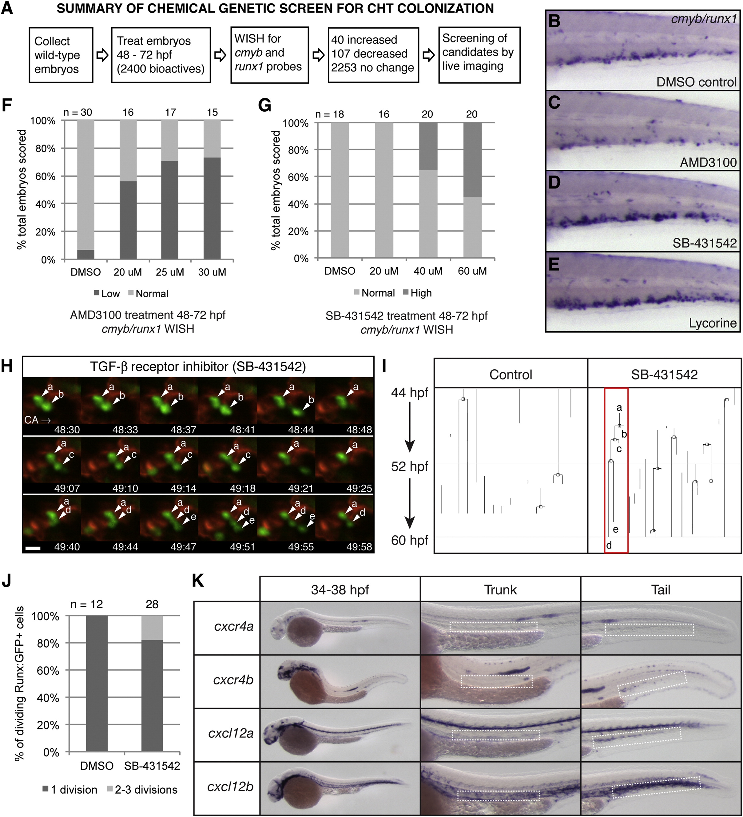 (F) Dose-dependent decrease in cmyb/runx1 expression levels with increasing concentrations of CXCR4 antagonist AMD3100. The linear regression of Y (response) on X (dose) is significant: r2 = 0.3567, p = 7.84E-9.