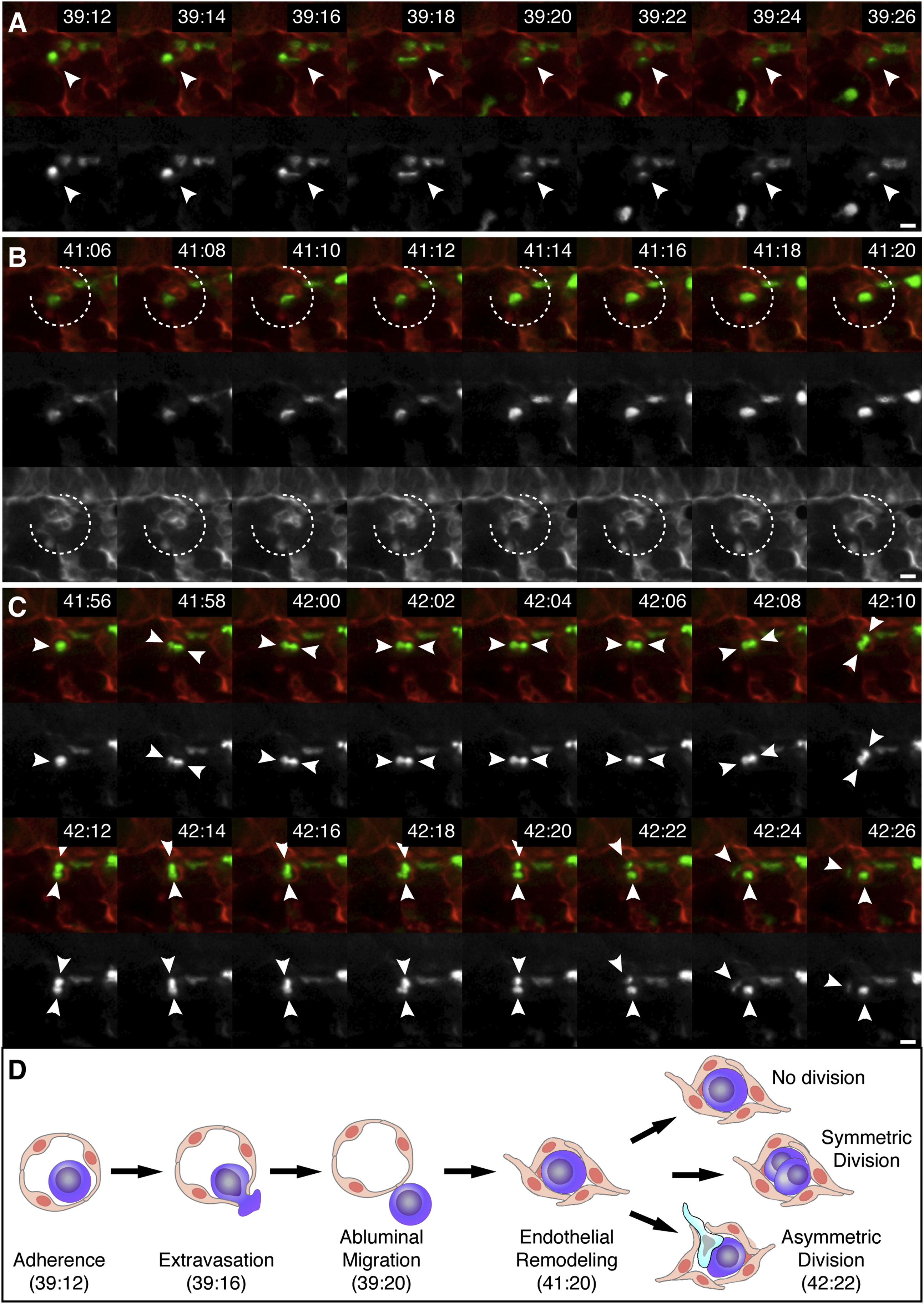 (D) A diagram summarizing the steps of HSPC lodgement in the perivascular niche. The times shown correspond to the time-lapse frames shown above. Other possible cell division decisions are shown.
