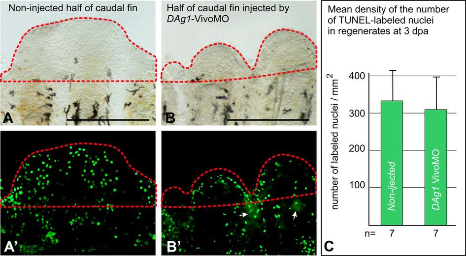 (A and A′). Revealing by TUNEL assay of apoptotic nuclei in regenerating part (framed by red dashed line) of the non-injected side of the caudal fin at 3dpa. Scale bar 500µm. (B and B′). Revealing by TUNEL assay of apoptotic nuclei in regenerating part (framed by red dashed line) of the side of caudal fin injected by DAg1Vivo MO at 3dpa. White arrows indicate traces of FLD co-injected with MO. Scale bar 500µm. (C). Quantification of TUNEL-labeled nuclei in the regenerating parts (regenerates) of caudal fins non-injected and injected by DAg1 Vivo MO.