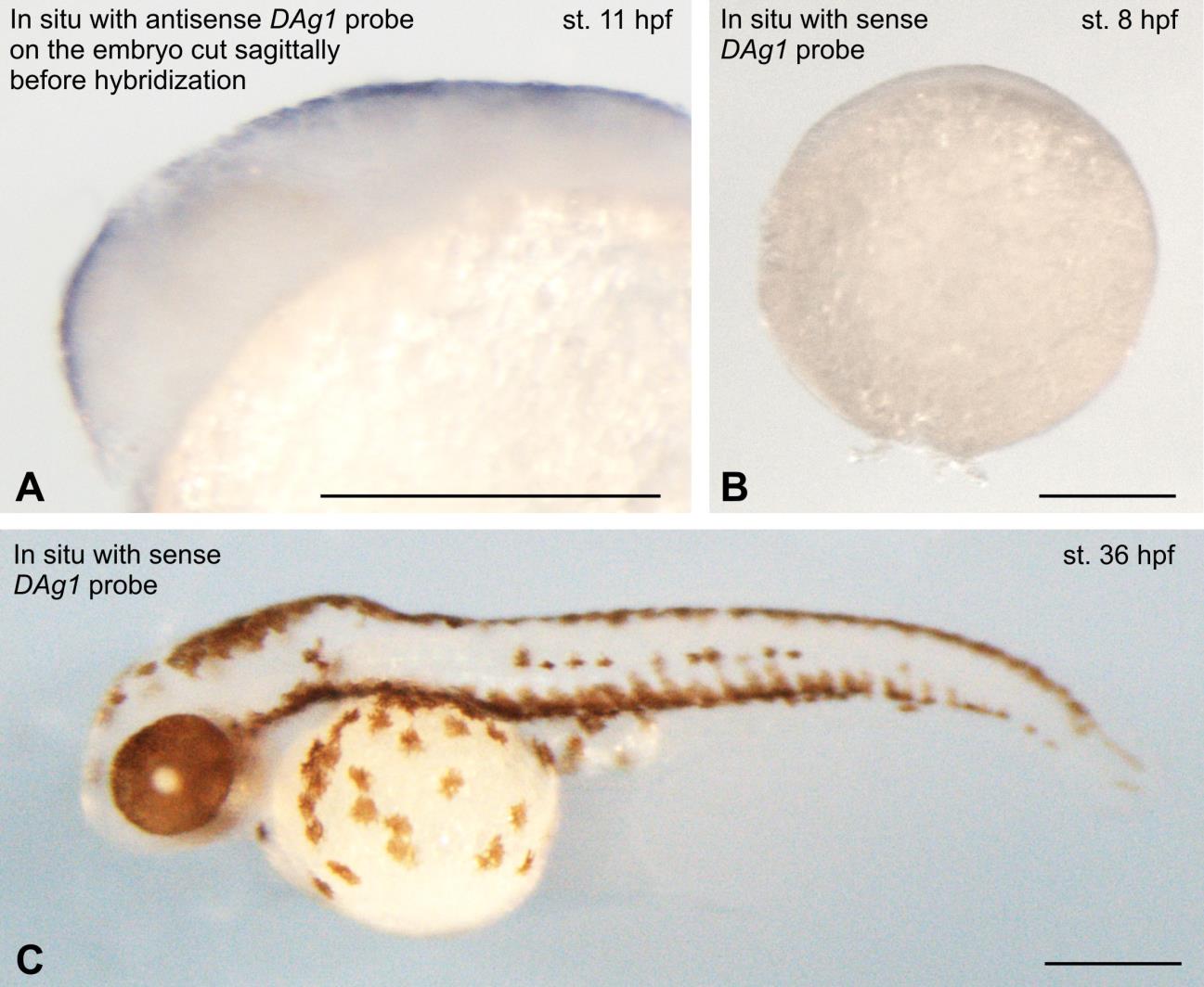 B and C. No signal was detected when embryos at 8 and 36 hpf were hybridized in whole mount with sense probe to DAg1. This result confirms specificity of the signal observed with antisense DAg1 probe. On C animal pole to the top. On C anterior to the left, dorsal side up. Scale bar everywhere is 200 µm