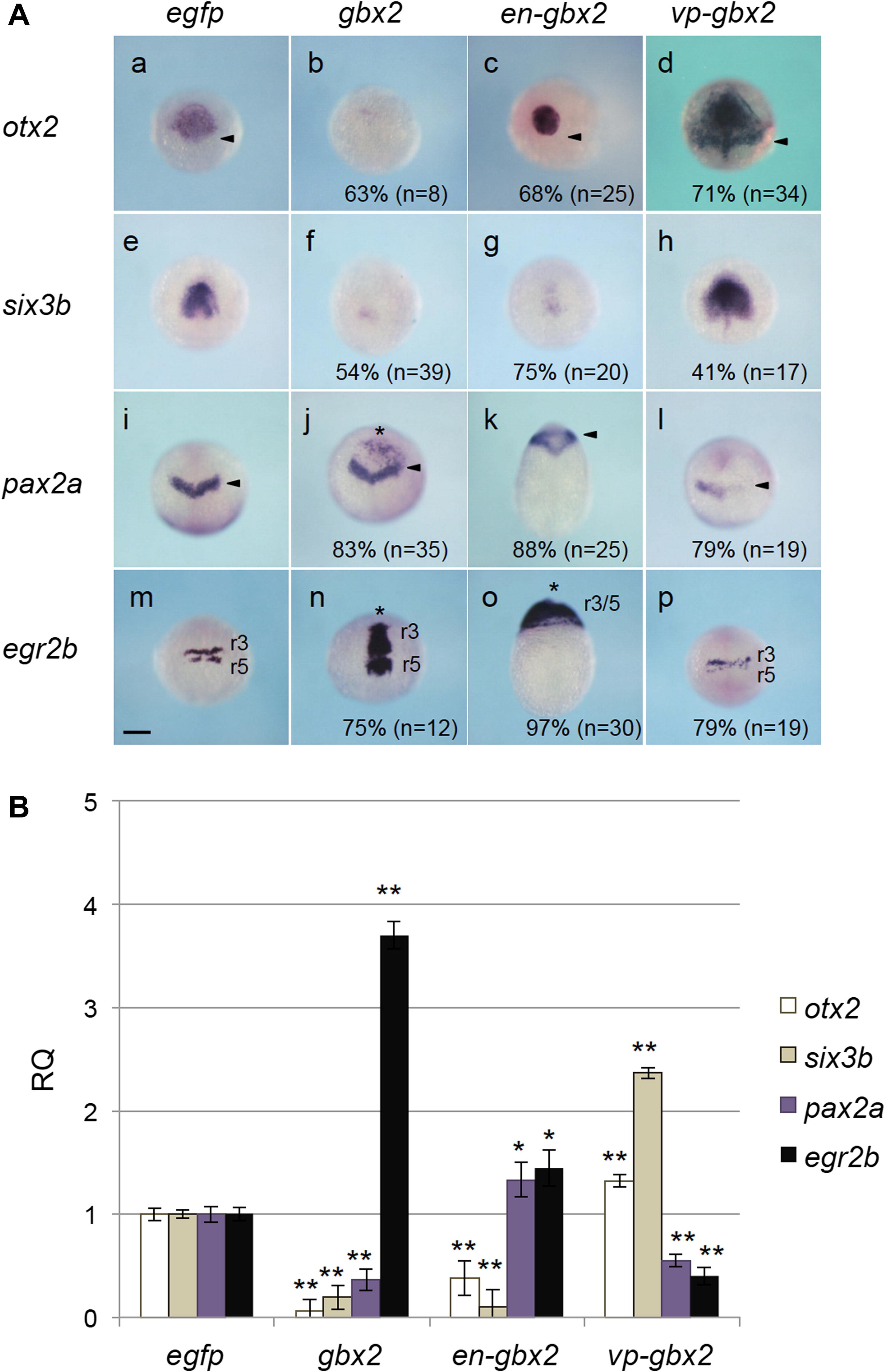 Effects of modified gbx2 genes on brain regionalization in the neural plate. (A) Embryos were injected with mRNA for egfp (100 pg/embryo), gbx2 (30 pg/embryo), en-gbx2 (30 pg/embryo), or vp-gbx2 (100 pg/embryo) and examined for the expression of brain regionalization genes at the bud stage. The proportions of the defects and total numbers of scored embryos are shown in the respective panels. The positions of the MHB are indicated by small triangles. Ectopic or expanded expression is marked by asterisks. Scale bar, 200 µm. (B) qPCR analysis of the effects of gbx2-related genes on brain patterning genes. The expression of brain patterning genes was examined in triplicate by qPCR analysis. Differences from control expression (egfp) were statistically tested by the Student’s t-test. p < 0.05; p < 0.01.