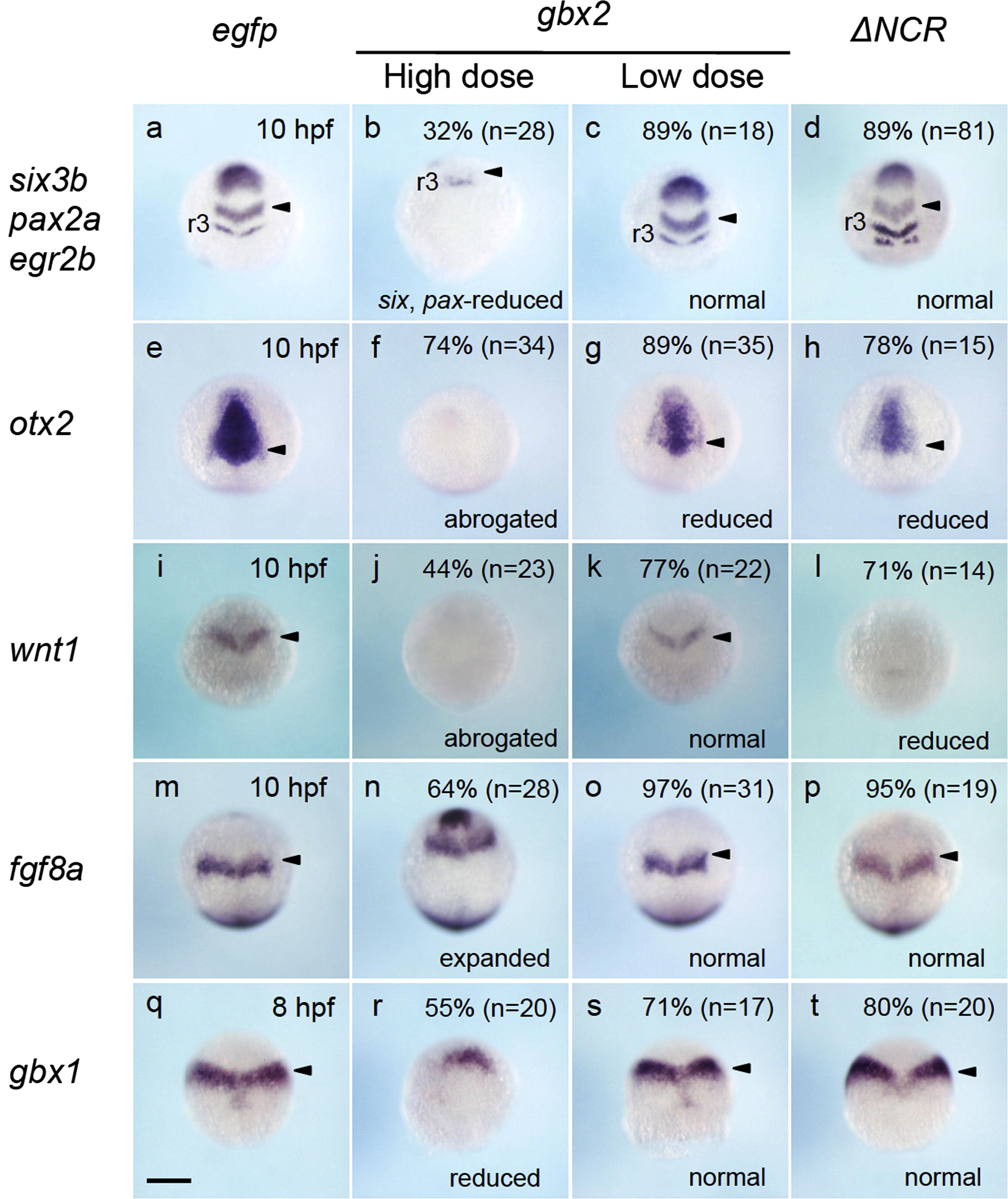 Effects of overexpression of gbx2 and gbx2-ΔNCR on regionalization of the neural plate at the end of epiboly. Embryos were injected with gbx2 mRNA of 5 pg/embryo (low dose) or 30 pg/embryo (high dose) and gbx2-ΔNCR mRNA of 100 pg/embryo mRNA and examined at the bud stage for the expression of brain regional marker genes shown on the left. The most striking phenotypes and their proportions are shown in the respective panels. The positions of the MHB are marked with small triangles. Scale bars, 200 µm.