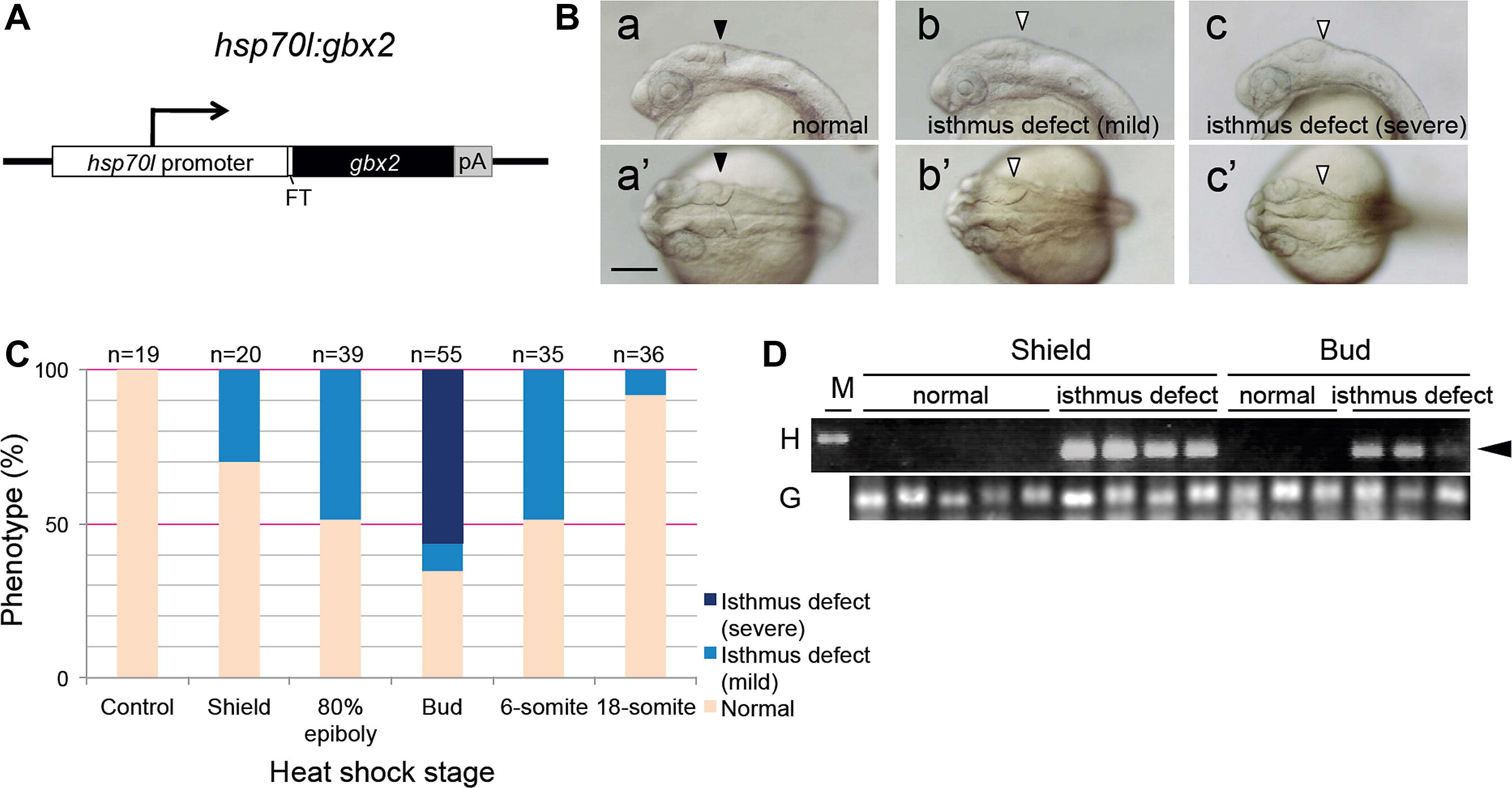 Effects of transient gbx2 induction on brain formation during development. (A) Schematic structure of heat-inducible gbx2 (hsp70l:gbx2). FT, FLAG tag; pA, polyadenylation signal. (B) Embryos treated with heat shock (HS) were observed at 24 hpf. Half were normal (a, a2), and the remaining embryos showed defects in the isthmus. (b, b2) Embryos showing incomplete isthmic constriction (mild isthmus defect). (c, c′) Embryos completely lacking isthmic constriction (severe isthmus defect). Scale bar, 200 µm. (C) Offspring embryos from a cross between wild-type and hsp70l:gbx2+/– Tg fish were exposed to HS at the stages specified at the bottom of the graph and scored for the isthmus defects at 24 hpf. (D) Genotyping of embryos exposed to HS at the specified stages. G, genomic sequences amplified for positive control; H, hsp70l:gbx2-derived sequences showing that the embryos harbored the transgene (arrowheads); (M) size marker (500 bp). All normal embryos were negative, and all affected embryos harbored the transgene.