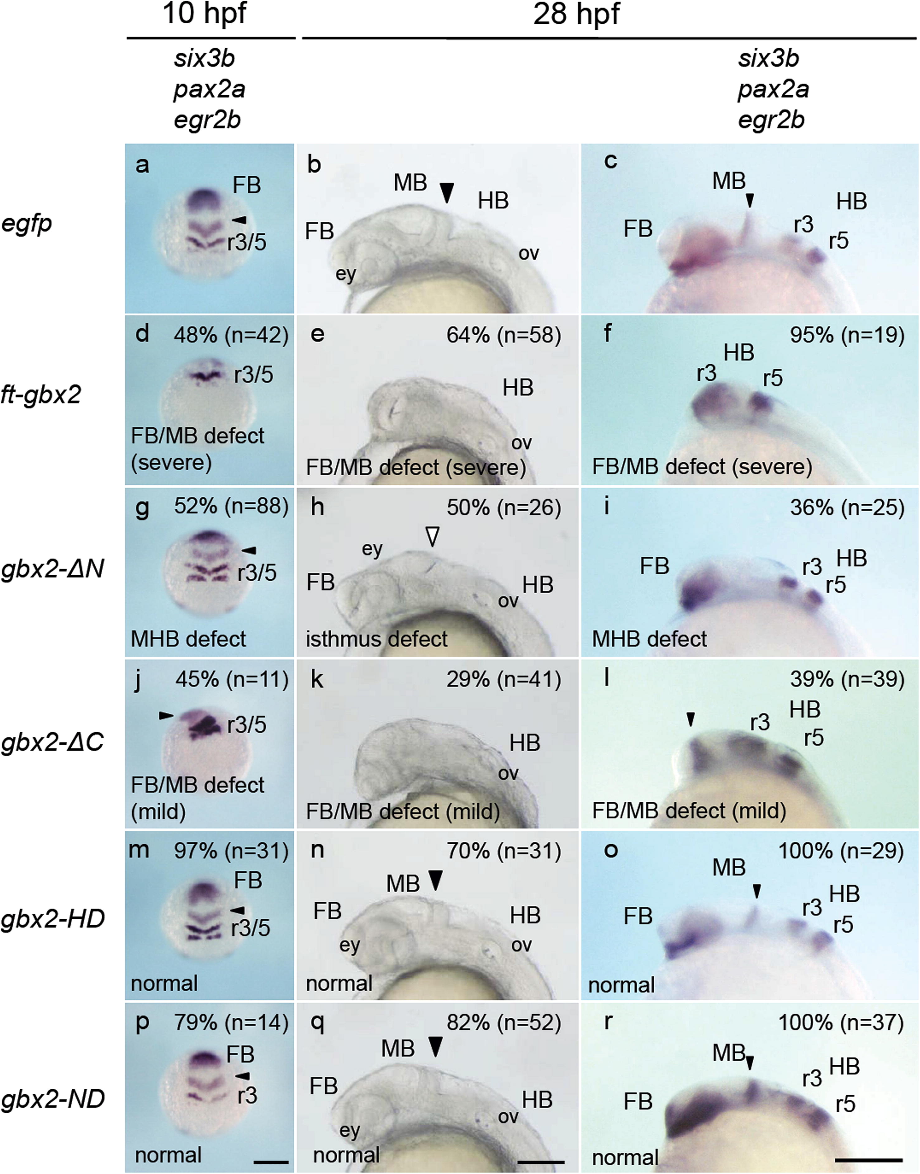 Effects of gbx2 deletion mutants on brain formation. Embryos were injected with mRNA for egfp, ft-gbx2, gbx2-ΔN, gbx2-ΔC, gbx2-HD, or gbx2-ND and examined at the bud stage (10 hpf, left column) and 28 hpf (right column) for the expression of six3b in the forebrain, pax2a at the MHB, and egr2b in rhombomeres 3 and 5 (r3 and r5, respectively) of the hindbrain or for the morphology of live embryos at 28 hpf (middle column). The most striking phenotypes and their proportions are shown in the respective panels. The positions of the MHB are indicated by small triangles. Normal and disrupted isthmuses are shown with solid and open large triangles, respectively. ey, eye; FB, forebrain; HB, hindbrain; MB, midbrain; ov, otic vesicle. Scale bars, 200 µm.