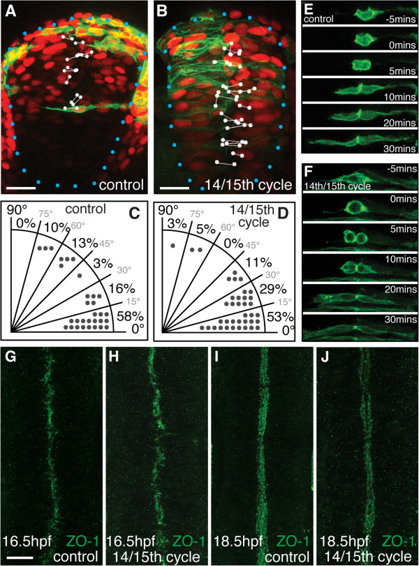 Neural progenitors do not count the number of cell cycles to measure time. (A,B) Most 16th cycle cell divisions in control embryos occur close to the midline with a mediolateral orientation. In a 14th/15th cycle embryo, most cells in the neural rod still divide close to the midline with a mediolateral orientation. The larger nuclei in the 14th/15th cycle embryos confirm that cells have undergone fewer divisions than controls. White dots indicate location of anaphase nuclei and the lines indicate division orientation. Blue dots outline edge of neural rod. Scale bar is 25 µm. (C,D) Quantification of cell division orientation in the neural rod of control ((C), n = 29) and 14th/15th cycle ((D), n = 38) embryos. An angle of 0° represents a mediolateral separation of daughter cell nuclei. An angle of 90° represents dorsoventral oriented separation of daughter cell nuclei during mitosis. (E,F) Timelapse frames from a control (E) or 14th/15th cycle (D) embryo. For both divisions, the cell rounds up and divides with a mediolateral orientation close to the midline at t = 0, and sister cells then separate across the midline by t = 30 minutes. (G-J) Dorsal view confocal projections through the hindbrain of zonula occludens 1 (ZO-1) staining in control or 14th/15th cycle embryos. At 16.5 hours post fertilization (hpf), ZO-1 is localized to the midline of the neural rod in control (G) and 14th/15th cycle (H) embryos. At 18.5 hpf, ZO-1 outlines the apical surface of the neural tube, and the ventricle has begun to open both in control (I) embryos and 14th/15th cycle (J) embryos. Scale bar is 25 µm in all figures.