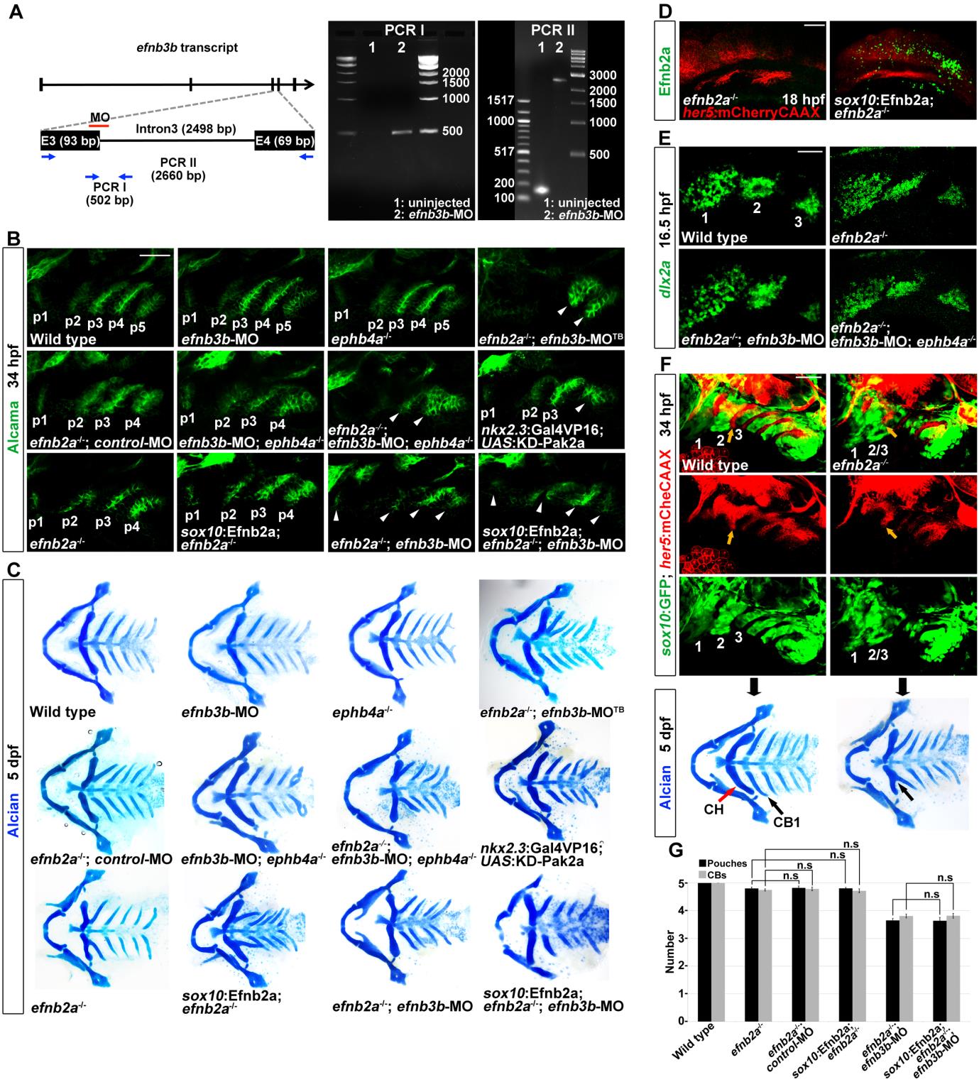 Fig. S2 EphB signaling in pouch, CB cartilage and neural crest development. (A) An MO was designed against the exon 3 (E3)-intron 3 splice junction of efnb3b. In uninjected control embryos, normal splicing of exons 3/4 resulted in excision of intron 3 (2498 bp) and loss of PCR amplification of 24-hpf embryonic cDNA by the designated primers (arrows of PCR I) and amplification of a 162 bp band spanning exons 3/4 (arrows of PCR II). By contrast, 24-hpf embryos injected with 1 nL of 300 µM efnb3b MO at the one-cell stage resulted in amplification of a 502 bp band (PCR I) and a 2660 bp band (PCR II), and loss of the 162 bp band spanning exons 3/4 (PCR II), due to a failure to splice out intron 3. (B) Alcama immunohistochemistry reveals normal pouches in efnb3b- MO and ephb4a-/- single mutants, and disrupted pouches in efnb3b-MO; ephb4a-/- and efnb2a-/-; efnb3b-MO; ephb4a-/- compound mutants. Whereas injection of a translationblocking efnb3b morpholino (efnb3b-MOTB) enhanced the defects of efnb2a mutant pouches, injection of a control morpholino antisense to the splice-blocking morpholino failed to enhance. Forced expression of a dominant-negative KD-Pak2a transgene in the nkx2.3+ endoderm (nkx2.3:Gal4VP16; UAS:KD-Pak2a) also resulted in reduced numbers of dysmorphic pouches. Compared with non-transgenic efnb2a-/- or efnb2a-/-; efnb3b-MO siblings, the sox10:Efnb2a transgene did not rescue pouches in EphrinB-deficient mutants. Arrowheads denote malformed pouches. Scale bar: 40 µm. (C) Alcian Blue staining of cartilage reveals no CB defects in efnb3b-MO and ephb4a-/- single mutants, and lost and/or fused CBs in efnb3b-MO; ephb4a-/- and efnb2a-/-; efnb3b-MO; ephb4a-/- compound mutants, as well as in embryos with endoderm-specific Pak2a disruption. Injection of a translation-blocking but not a control efnb3b-MO into efnb2a mutants enhanced CB defects of efnb2a mutants. sox10:Efnb2a transgene in either efnb2a single mutants or efnb2a-/-; efnb3b-MO compound animals failed to rescue losses of CBs and fusions of CH and CB1. (D) Immunohistochemistry at 18 hpf shows that Efnb2a protein is lost in efnb2a mutants and restored to migratory neural crest mesenchyme by the sox10:Efnb2a transgene. her5:mCherryCAAX labels pre-pouch endoderm where Efnb2a expression is not restored. Confocal projections are shown. Scale bar: 40 µm. (E) Fluorescent in situ hybridization for dlx2a (green) at 16.5 hpf shows no intermingling of neural crest cells between the three migrating streams (numbered) in embryos with losses of EphrinB ligands and EphB receptors. Scale bar: 40 µm. (F) Development of pharyngeal arches, pouches and cartilages in individual efnb2a mutants and wild-type siblings. In wild types at 34 hpf, labeling of neural crest-derived cells by sox10:GFP (green) shows six arches, and labeling by her5:mCherryCAAX (red) shows five pouches. Note that arches 2 and 3 are fully separated by the second pouch (yellow arrow), and by 5 dpf, Alcian Blue staining reveals that the CH and CB1 cartilages are well separated. In the efnb2a-/- example, the second pouch does not extend as far ventrally (yellow arrow) and arches 2 and 3 appear fused ventrally. In this same animal at 5 dpf, CH and CB1 cartilages are also fused ventrally (arrow). Scale bar: 40 µm. (G) Quantification of pouch and CB defects. Data represent mean±s.e.m. n.s., not significant.