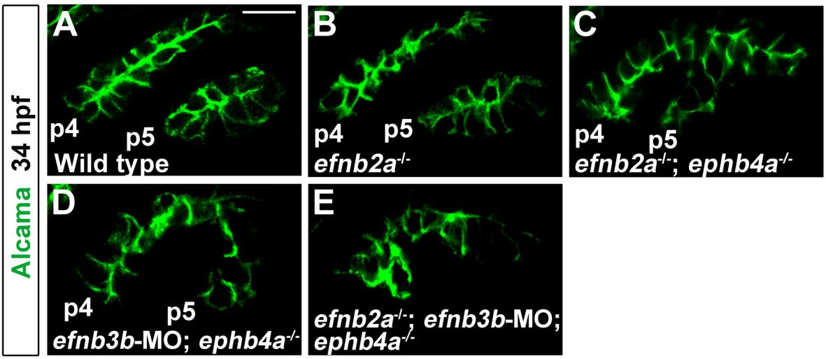 Fig. S3 Requirements of Eph-ephrin signaling in pouch morphology. (A-E) High magnification confocal sections show pouches p4 and p5 labeled by Alcama immunohistochemistry at 34 hpf. In contrast to wild-type pouch epithelial cells that form bilayers with straight lines of apical membranes, pouch epithelial cells from Eph-ephrin deficient embryos appear disorganized.