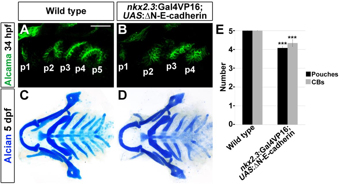 Fig. S5 Requirement of E-cadherin in pouch morphogenesis. (A-D) Forced expression of a dominant-negative N-terminally-truncated E-cadherin transgene in pouch endoderm (nkx2.3:Gal4VP16; UAS:&916;N-E-cadherin) resulted in reduced numbers of dysmorphic pouches (B), as well as fusions of CB cartilages (D). Scale bar: 40 Δm. (E) Quantification of pouch and CB defects. Data represent mean±s.e.m. *** shows P<0.001 relative to non-transgenic ‘wild-type’ siblings. Development