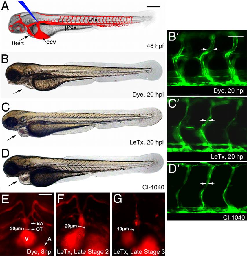 LeTx effects in zebrafish embryos. (A) Diagram of zebrafish embryo at 48 hpf (time point of toxin protein microinjection, at blue arrow), functional vasculature in red. (B–D) Images were taken at 68 hpf. (B) An inert phenol red dye was injected as vehicle in all control embryos and a WT phenotype was observed at 68 hpf, or 20 hpi. (C) 1× LeTx (defined below) generated pericardial edema and narrowed vessels (C′). (D) Embryo was treated with 2.5 µM CI-1040 at 48 hpf for 6 h, then washed out. Black arrow indicates heart and pericardial edema in A–D. (Scale bar, 250 µm.) (B2–D2) Enlarged images showing LeTx and CI-1040 induced narrowing of ISVs in Tg(fli1:EGFP)y (19) embryos, indicated by arrows. (Scale bar, 80 µm.) (E–G) LeTx-injected Tg(gata1:dsRED) (21) embryos exhibited outflow tract lumen size reduction from 20 µm to <10 µm between LeTx phenotype stages 2 (F) and 3 (G). (Scale bar, 50 µm.) DA, dorsal aorta; PCV, posterior cardinal vein; CCV, common cardinal vein; ISV, intersegmental vessel; BA, bulbous arteriosus; OT, outflow tract; A, atrium; V, ventricle, for all figures. 1× LeTx is defined as 37 fmol of LF and 25 fmol of PA.